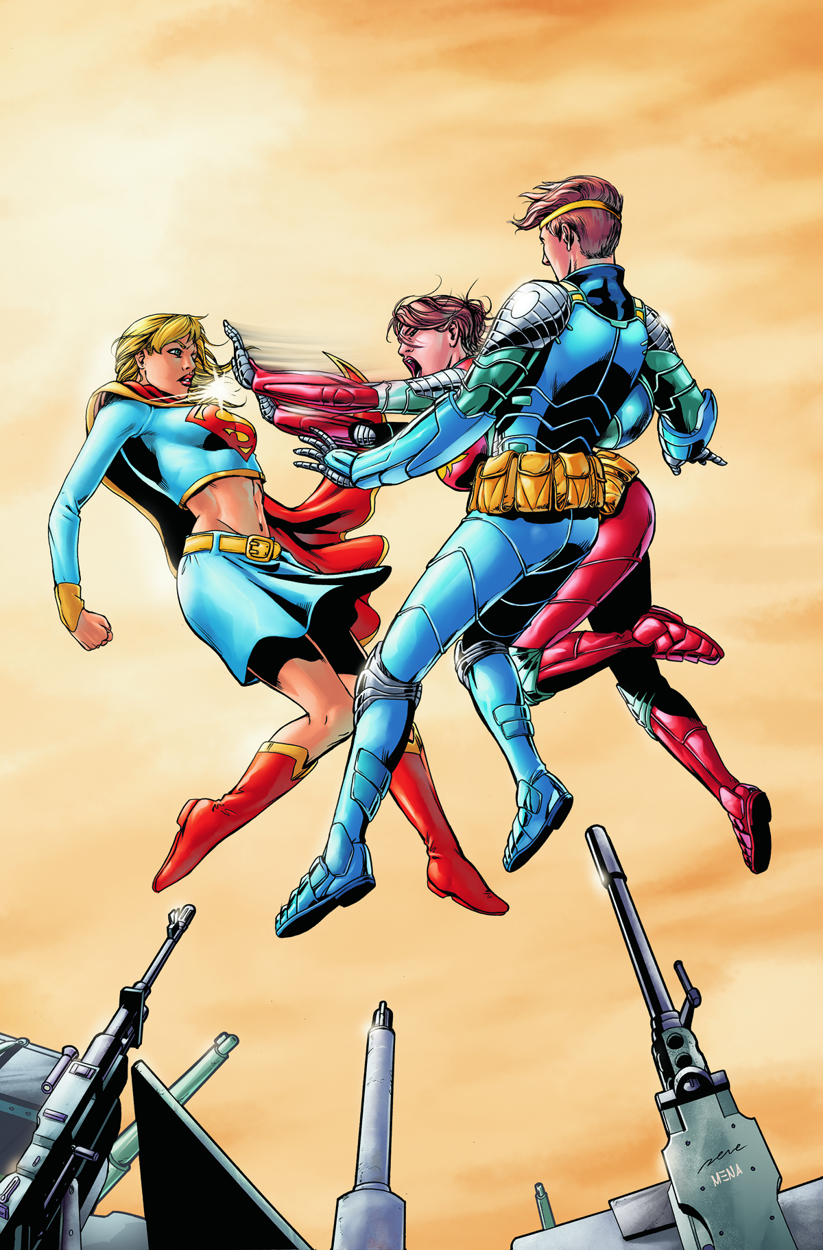 "The Hunt for Reactron" starts here! Spilling out of the stunning finale of "Codename: Patriot," Supergirl and Flamebird find themselves at each other's throats! What's happened to these two childhood friends to put them at such odds, and can Nightwing calm them down before the situation escalates? And just what are they going to do about all of the guys who are surrounding them? You know, the guys in the tanks? Continued in SUPERGIRL #45!