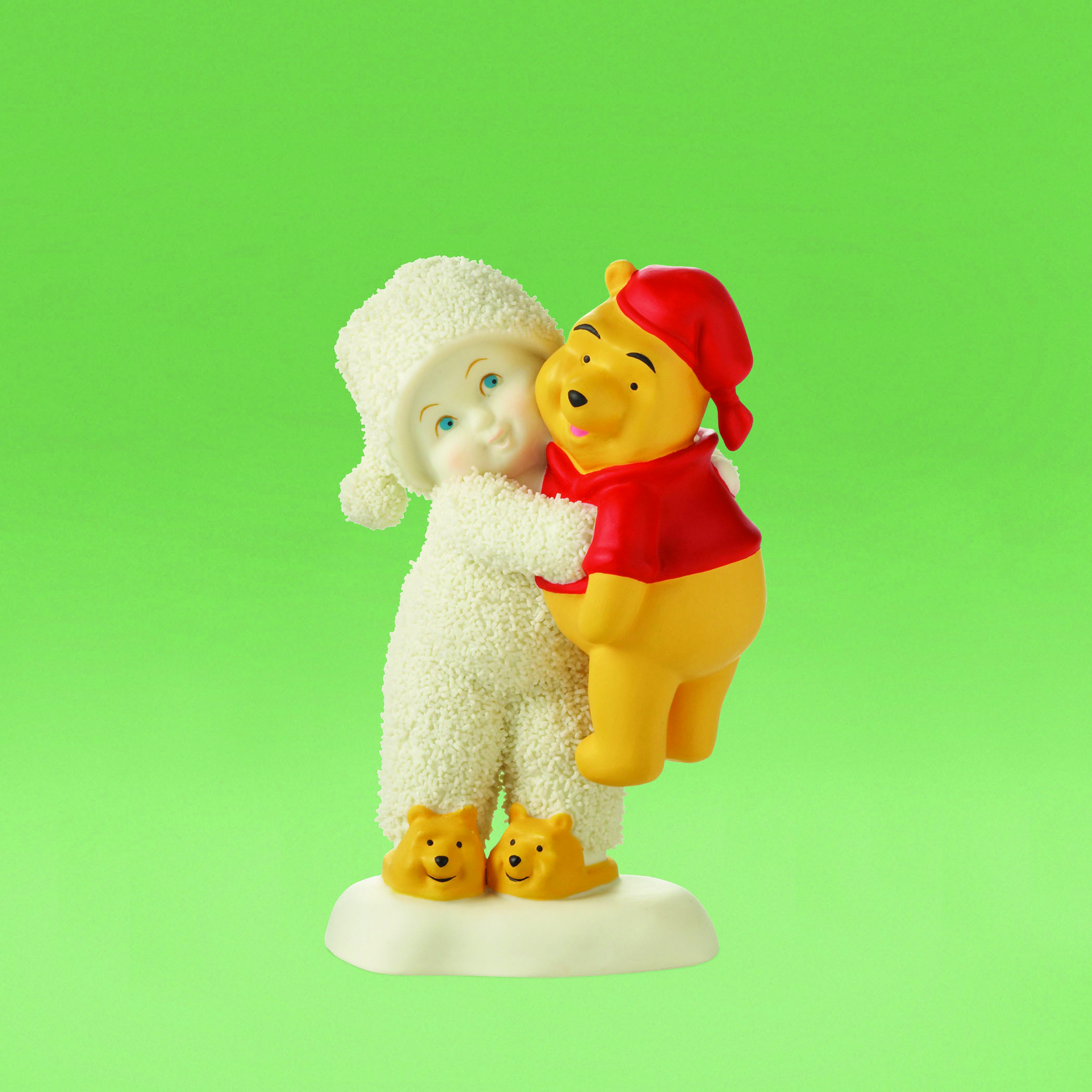 Taking their inspiration from both Disney's animated Winnie-the-Pooh stories and Department 56's popular Snowbabies characters, these pieces bring the joy and harmony of the holiday season home! One Snowbaby, wearing Pooh slippers, hugs Pooh Bear tightly in a piece that stands 2 3/4" tall. Eeyore is sheltered from the cold as a Snowbaby wraps him with a blanket in a figurine that stands 3 1/2" tall. Each Snowbabies figurine is crafted of painted bisque and will brighten any Christmas display.