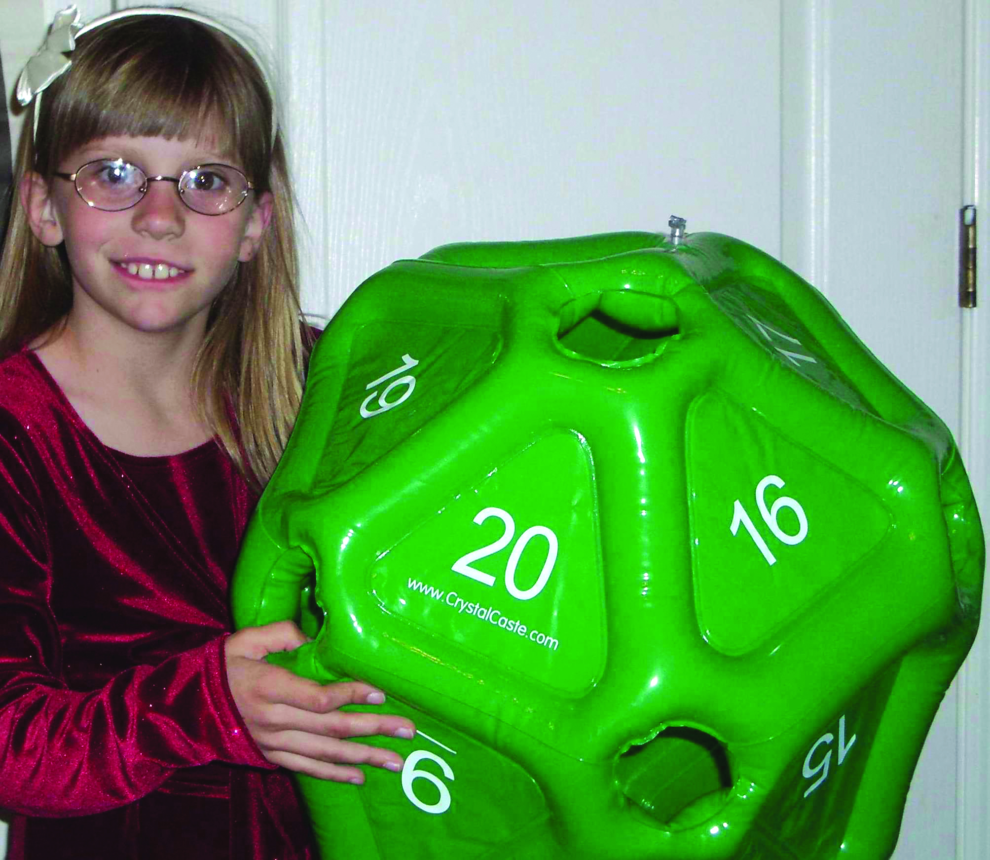 The Inflatable D20 measures 17" x 17" and rolls true! This is the largest D20 available on the market and can be used for game play. Great as a novelty or to be used for that game by the pool! Available in Green and Blue.