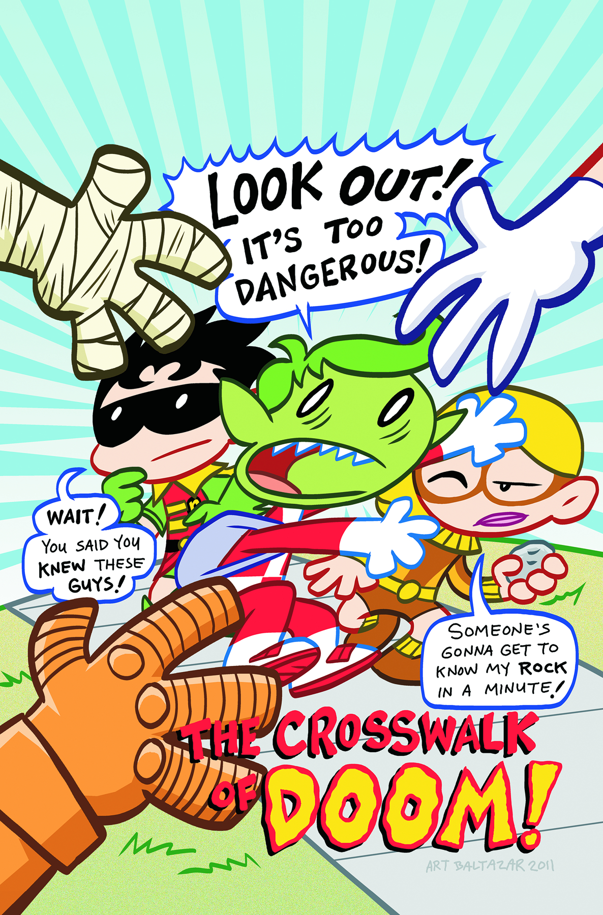 It's the issue of doom! Join the Tiny Titans as they - walk to school! Beast Boy takes a wrong turn when confronted by the crossing guards he calls The Doom Patrol. Plus, witness Beast Boy's first encounter with the Crossing Patrol Boys of Doom! Crossing the street has never been so tough!