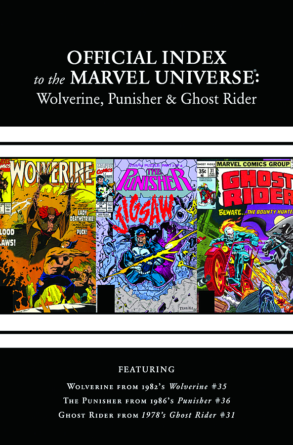 The chronicle of the Marvel Universe continues its coverage of Wolverine (from 1991's WOLVERINE #35), the Punisher (from 1990's PUNISHER #36) and Ghost Rider (from 1978's GHOST RIDER #31). Watch the Marvel universe's history unfold month by month as we provide synopses for dozens of individual comics, including backup strips - introducing the characters, teams, places and equipment that appeared within; and providing vital information about first appearances, where they last showed up and where they appeared next!