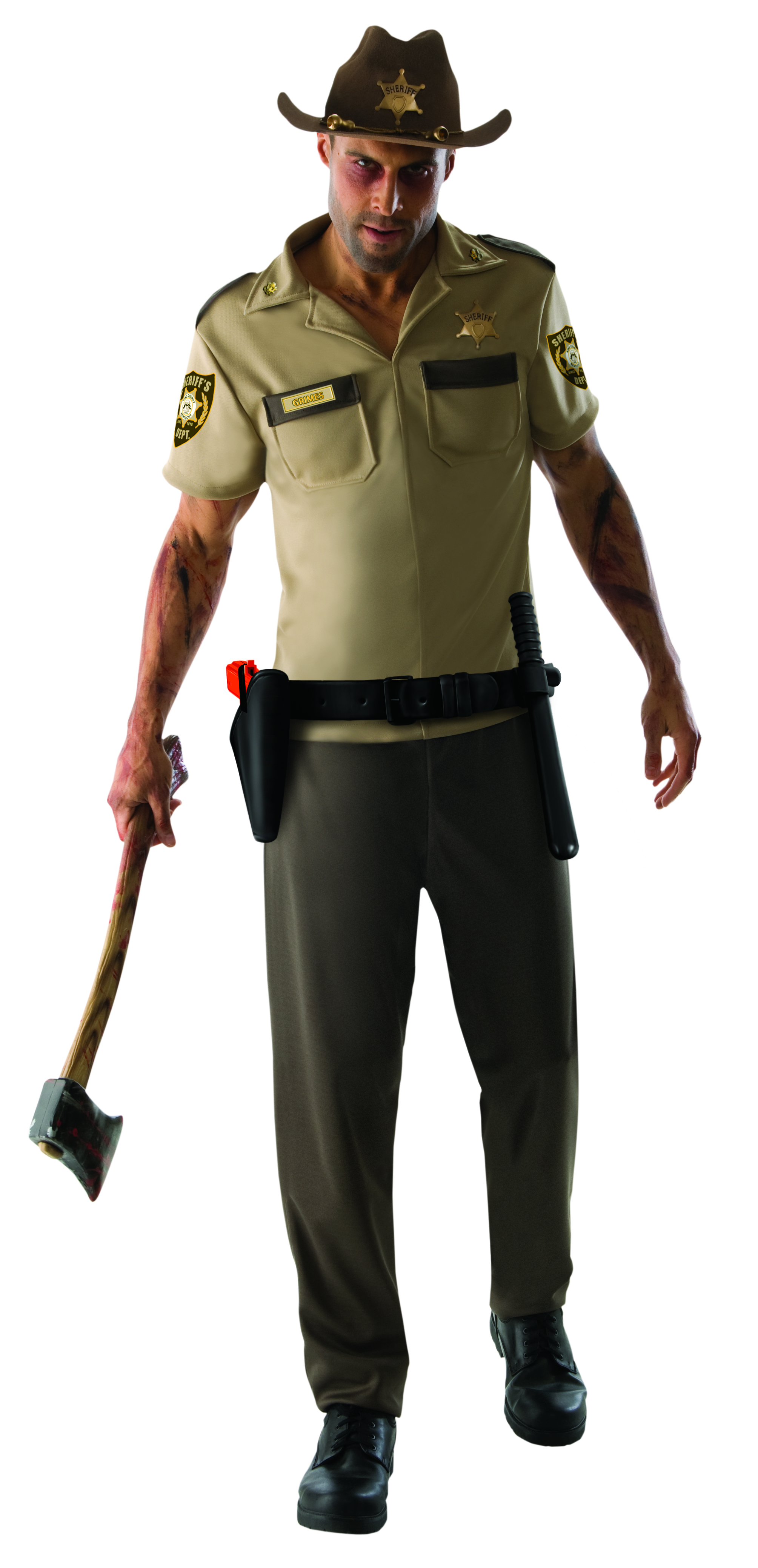 The Walking Dead! The costume includes Sheriff's hat, shirt, pants, and police belt, complete with baton, phone, handcuffs, keys, pistol, and flashlight. The costume fits up to size 44.