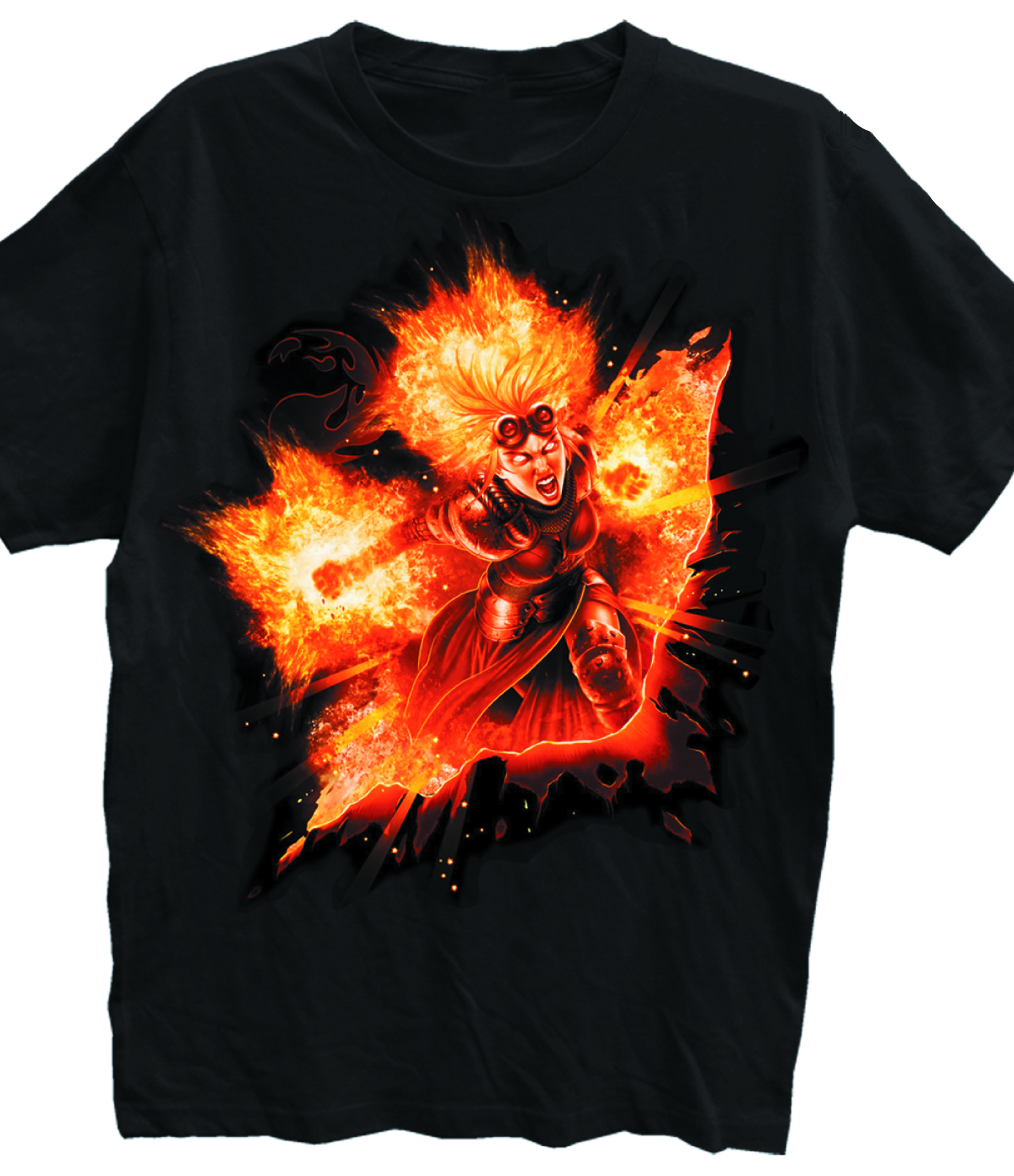 Chandra wields fire on this black Magic the Gathering t-shirt!