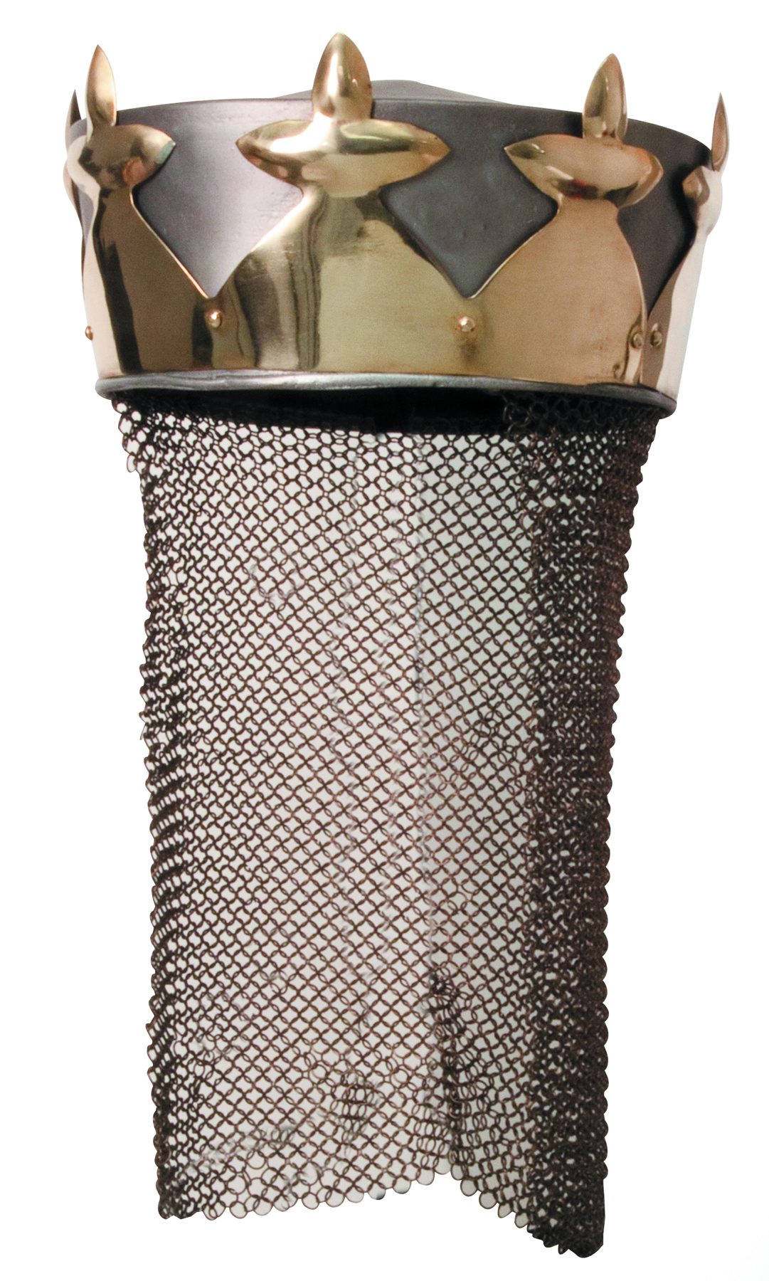 This royal helmet will not let you cut down a tree with a herring. However, it is made of lightweight, soft polyurethane and is painted to have an antique steel finish. The crown is real polished brass with a lightweight brass comail (chain mail skirting) attached. One size fits most. Completes the King Arthur costume. Made by Windlass Steelcrafts.