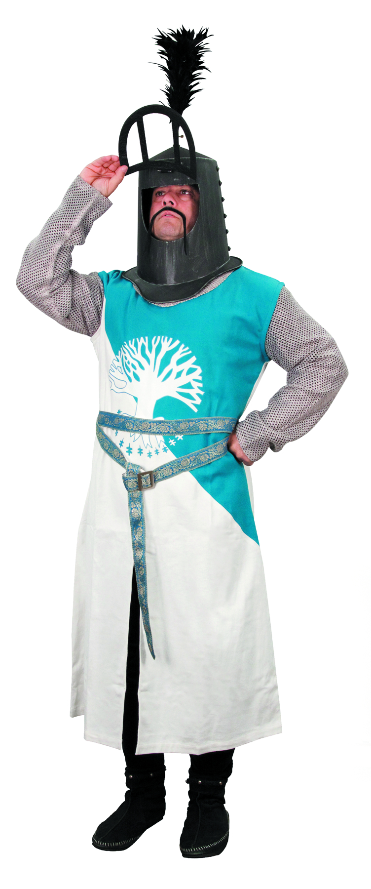 From Monty Python and the Holy Grail: The perfect ensemble for determining the validity of a witch! Made of soft 100% cotton, the tunic of Sir Bevedere has the coat-of-arms on the front and polyester faux steel chain mail sleeves sewn in. Comes with a faux chain mail mantle, while a hidden zipper in the back allows for easy on-and-off. A matching medieval knightly belt is included. Helmet sold separately. Small/Medium is ideal for people 5' 6" to 5' 11" tall, while the Large/X-Large is best for people 6' tall and over.