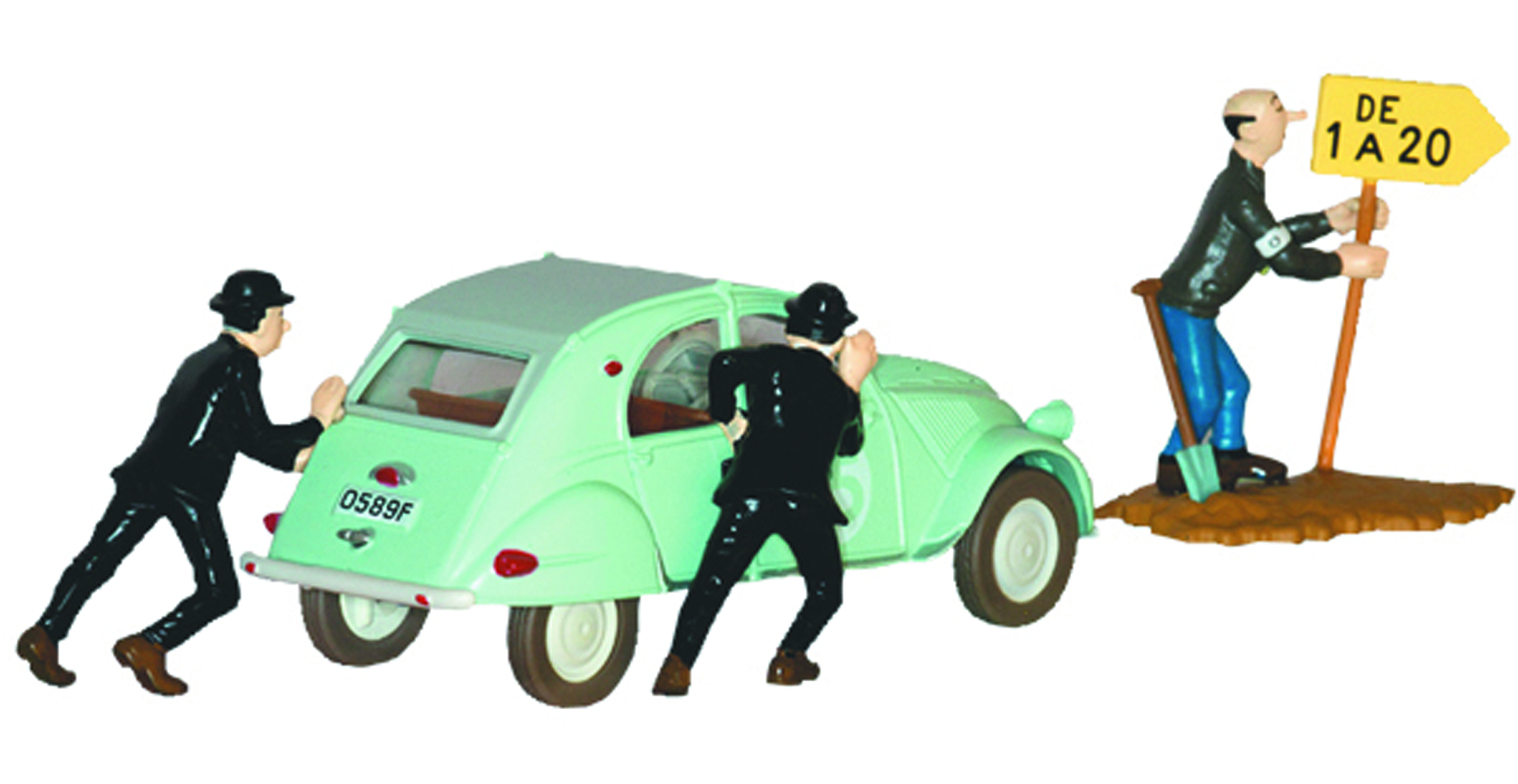 , this figurine shows Thomson and Thompson pushing their Citroen. The figurine measures 3 1/2" x 1.5".