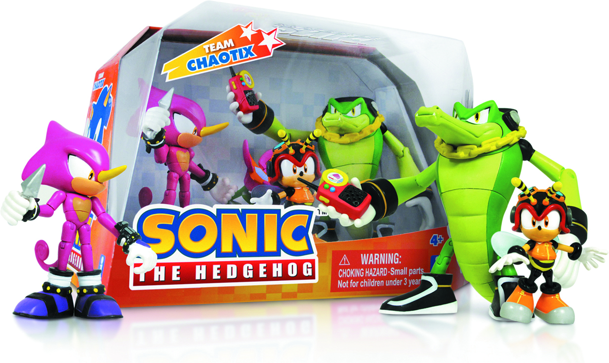 Sonic the Hedgehog games, this boxed set brings you the entire active Team Chaotix core member line-up - Vector, Espio, and Charmy Bee! Highly articulated and poseable, each figure includes a cool accessory, too. Charmy Bee has the Warping Flower, Espio his Kunai and Vetor his Walkie Talkie. Blister card packaging.
