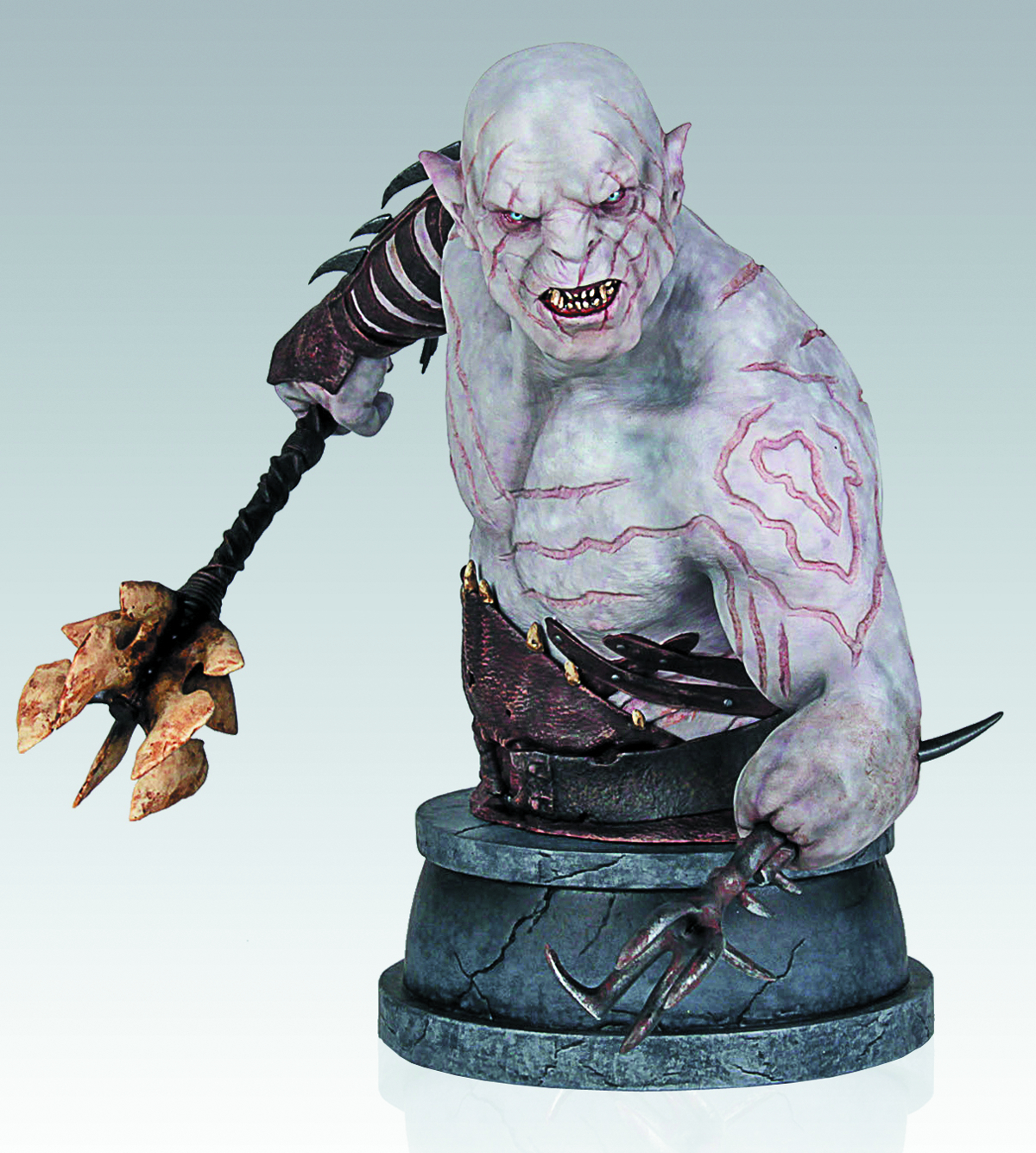 A Gentle Giant Release! Few creatures strike as much terror in the hearts of their foes as Azog, the fearsome Orc chieftan who invaded Moria, drove out the Dwarves, and claimed their ancestral home for his own. Standing over 7 feet tall, this icon of evil became the stuff of legend, etching his name in Dwarven history forever. Featuring an unprecedented level of detail, the Azog Mini-Bust is truly a sight to behold. From his rippling muscles to his many battle scars to the deadly spike that has replaced his severed hand, no detail has been overlooked. This piece has been cold cast using only the highest quality polystone, then hand-painted. Azog comes individually numbered with a matching Certificate of Authenticity.