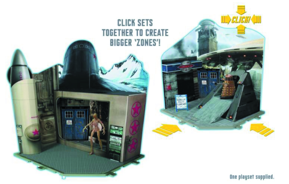 Doctor Who with these 3-D card diorama playsets that feature different time zones visited by the Doctor in the hit television series. You can travel between different time zones or clip the sets together to build bigger "zones." The playsets are in scale with the Doctor Who 3 3/4" action figures so you can create your own adventures or simply display your collection. There are two Time Zone playsets to collect -