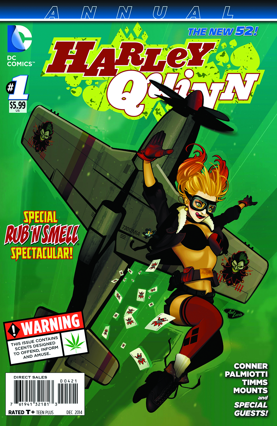 We have to warn you, readers: This issue stinks! Seriously! Like, unpleasant odors are literally in the story! In this first-ever HQ ANNUAL, take a trip to Harley's home of Coney Island in a groundbreaking "scent-ticular" issue, featuring actual, honest-to-gosh smells. This issue comes polybagged to contain the stench.