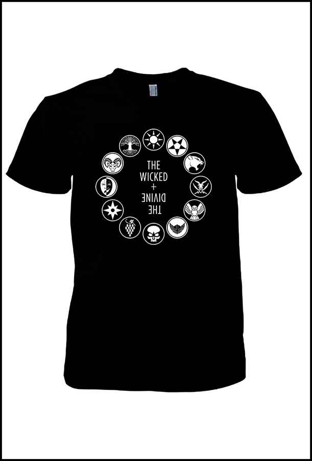 Display your loyalty to the modern The Wicked + The Divine pantheon with this fine T-shirt, sporting all iconic logos. By wearing it. As it's a T-shirt. You wear it.