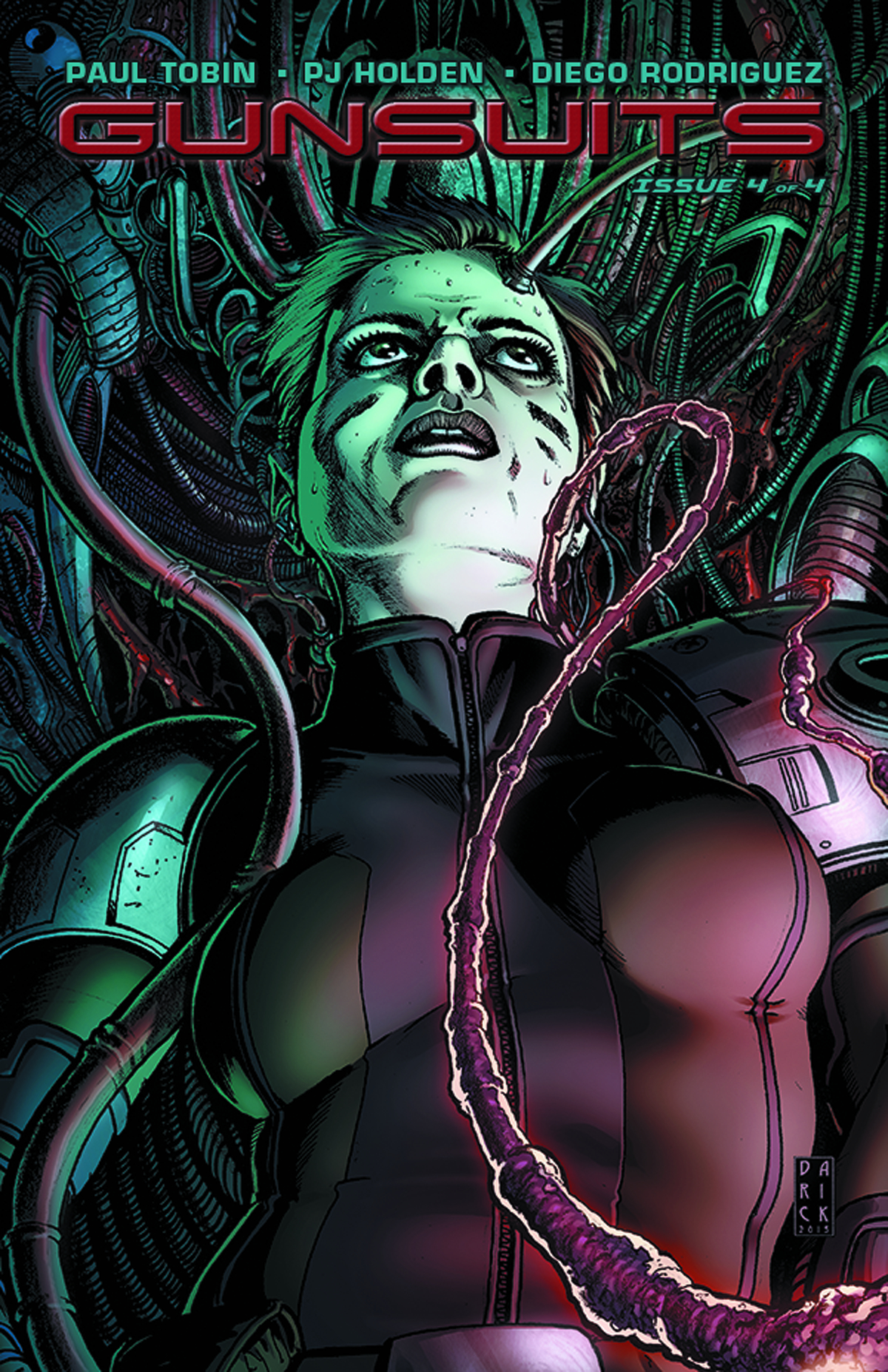 Potts finally gets up close with the alternate version of herself driving the bio-mech! She's big, scaly, and mean as hell, but Potts refuses to give up. Her last chance is to use the enemy's own weapons against them. Biological warfare takes on a whole new meaning in the action-packed final pages of GUNSUITS. Don't miss the conclusion to this mind-bending Sci-Fi series!