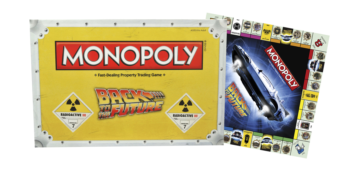 Want to travel from 2015 to 1985 to 1955 to 1885 in the comfort of your own home? Well, now you can! This fully licensed Back to the Future Monopoly board game provides hors of fun as you collect locations and time-hop through the world of the BTTF trilogy! The game board features all-new properties taken straight from the films, including Café '80s and Doc's Mansion, plus you get new "Chance" and Community Chest" cards, and new die-cast metal game pieces of the time machine, Einstein the dog, the cowboy hat, the futuristic sneaker, the hoverboard and the famous Hill Valley clock! Game comes packaged in a full-color box resembling a case of plutonium.