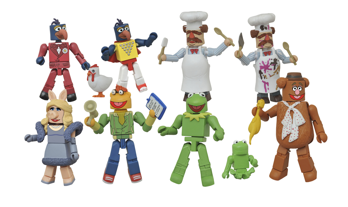 A Diamond Select Toys release! It's time to light the lights! DST is proud to introduce the very talented Muppets to the Minimates line! This first series of two-packs features the Muppet Show's greatest stars, including Kermit with Miss Piggy, Fozzie with Scooter, Gonzo with the Swedish Chef, and Stunt Show Gonzo with a "Batter-Damaged" Swedish Chef. Each Minimates mini-figure features up to 14 points of articulation, as well as interchangeable parts and accessories. Each two-pack is packaged on a full-color blister card.