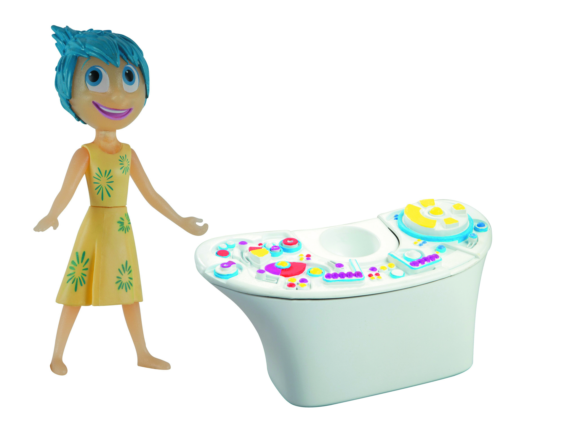 The Console is at the center of the Headquarters. It's what the emotions use to control Riley's mood and actions. Joy is always ready to take charge when something great happens! The Console comes with a unique Joy Figure. Bring her or any one of the Core Figures (sold separately) near the Console and the figures will glow! The Core Figures' (sold separately) Memory Spheres fit into the Memory Sphere holder of The Console and when you press the button on the control panel, the surface of The Console will light up. The Console can be added to the Headquarters Playset (sold separately) for even more play!
