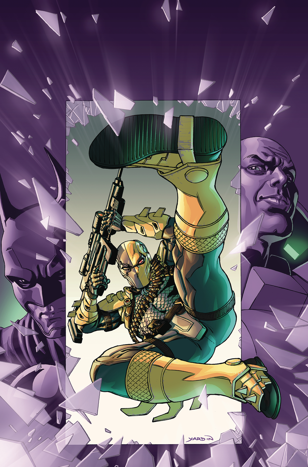 Enter: Deathstroke! Batman and Luthor are close to finishing a device that will open a door to another reality and bring them some much-needed assistance that could finally end this war. But they need a component that only Slade Wilson can retrieve. Can he be trusted? Meanwhile, Raven re-enters the fray, and a couple of dark gods conspire to cause trouble on Earth.