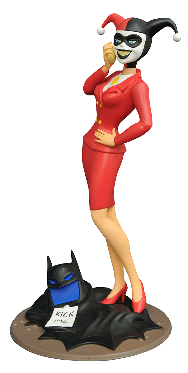 A Diamond Select Toys release! Who knew Harley Quinn was such a Mistress of disguise! In this all-new PVC figure based on Batman: the animated series, a suit-wearing Harley Quinn re-applies her make-up after going undercover as a lawyer in the classic episode "The Man Who Killed Batman." At her feet lies Batman's cape and cowl, with a "Kick Me" sign stuck to the back. This 9" scale PVC figure features collectible-quality sculpting and paint applications, and is in scale to all Gallery and Femme Fatales PVC figures. Packaged in a full-color window box.