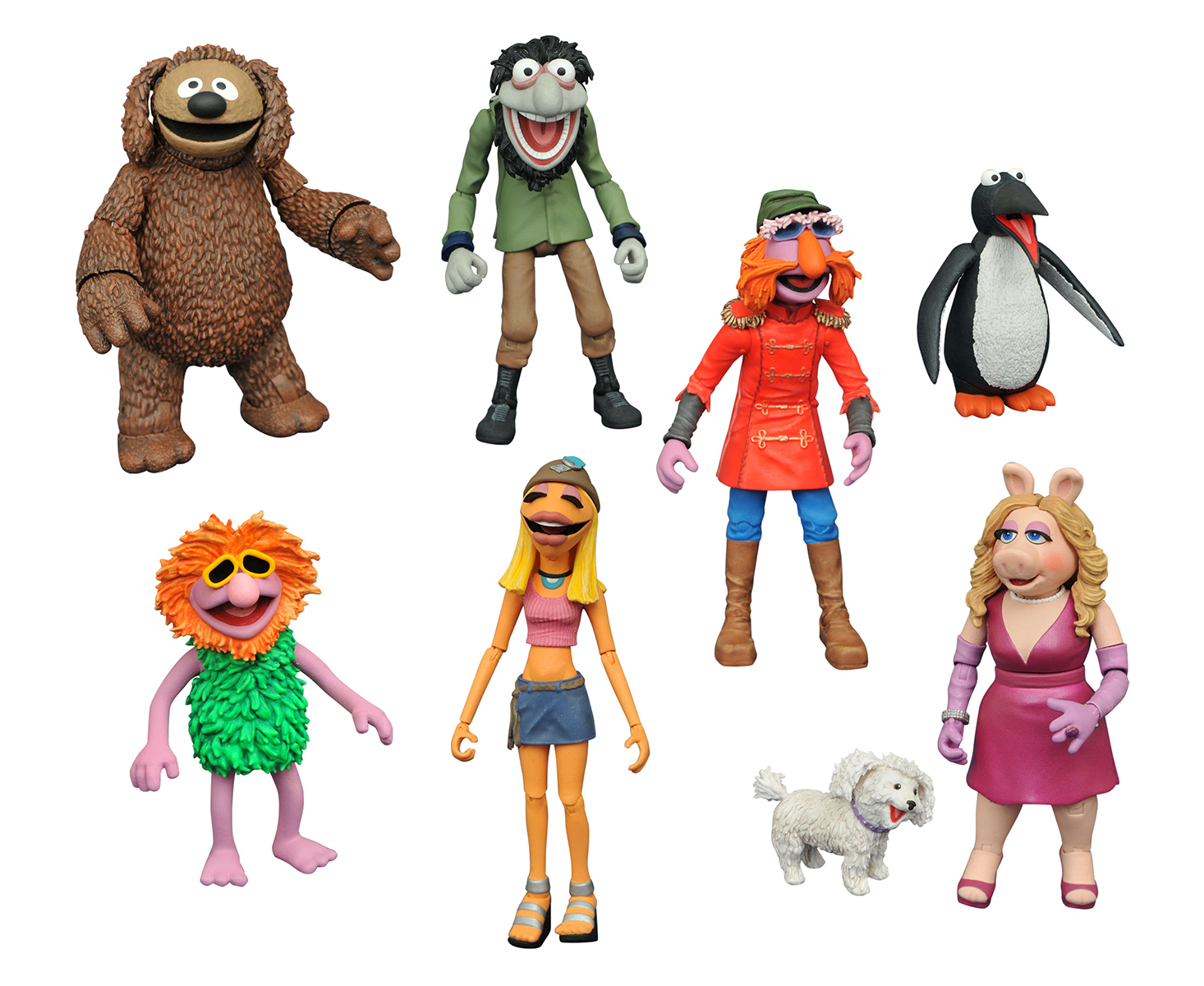 A Diamond Select Toys Release! It makes us very happy to introduce to you the next assortment of Muppets Select action figures from DST! Muppet Show and Up Late star Miss Piggy comes with her precious dog Foo Foo and a Penguin, while Electric Mayhem bassist Floyd Pepper comes with guitarist/love interest Janice, and pianist Rowlf comes with the certifiable Crazy Harry! Each multi-pack of 4-6" figures comes with accessories, including guitars, a movie camera, a detonator and a penguin! Packaged in display-ready Select packaging, with spine artwork for shelf display. Sculpted by Gentle Giant Studios!