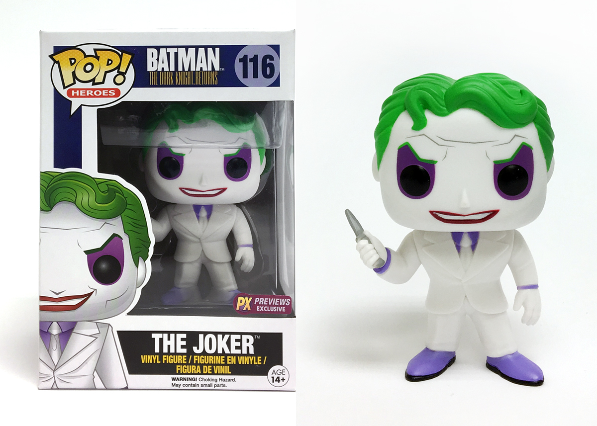 A PREVIEWS Exclusive! Funko celebrates the 30th-anniversary of Frank Miller's seminal graphic novel, The Dark Knight Returns, with a special series of POP! Vinyl Figures available only through PREVIEWS and your local comic shop! From the crime-ridden Gotham City of the near future comes these figures, rendering the characters of Miller's graphic novel in the fan-favorite POP! vinyl style! Choose from Batman (Blue), Batman (Black), Batman (Armored), Batman (Armored Unmasked), Carrie Kelly Robin, The Joker, or Superman! Each figure stands 3 1/2" tall and features limited articulation. Build your collection of POP! vinyl figures based on The Dark Knight Returns today! Window box packaging.