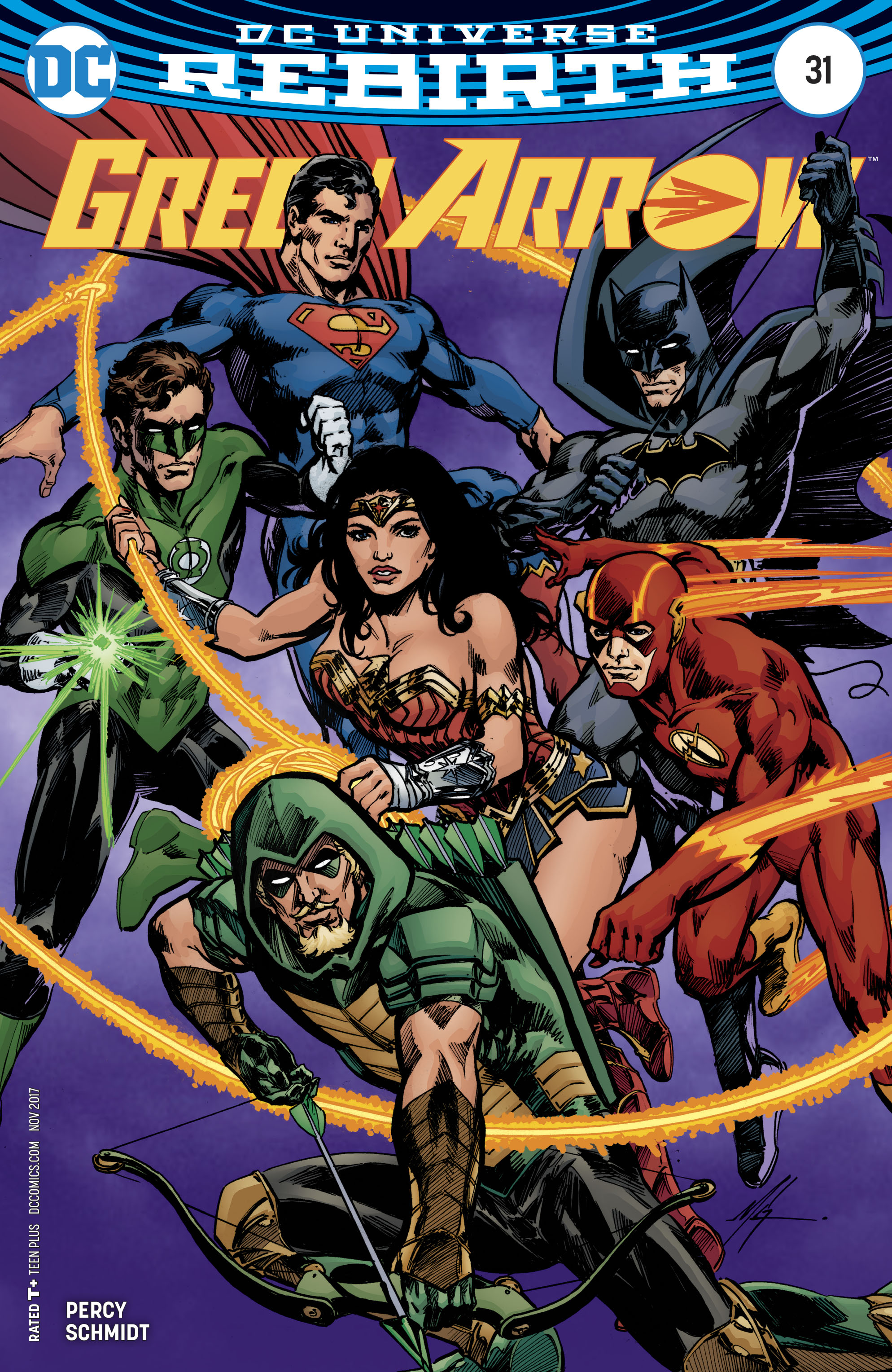 "HARD TRAVELING HERO" finale! For a year Oliver Queen has been one step behind the Ninth Circle. Now he knows why: an orbiting fortress from which the super-villain financial empire secretly spies, steals, buys, sells and kills everyone and everything Green Arrow needs to defeat them. And. It. Is. Going. DOWN. It'll take the whole Justice League to clean up the mess in this epic conclusion to the most star-studded GREEN ARROW story ever!