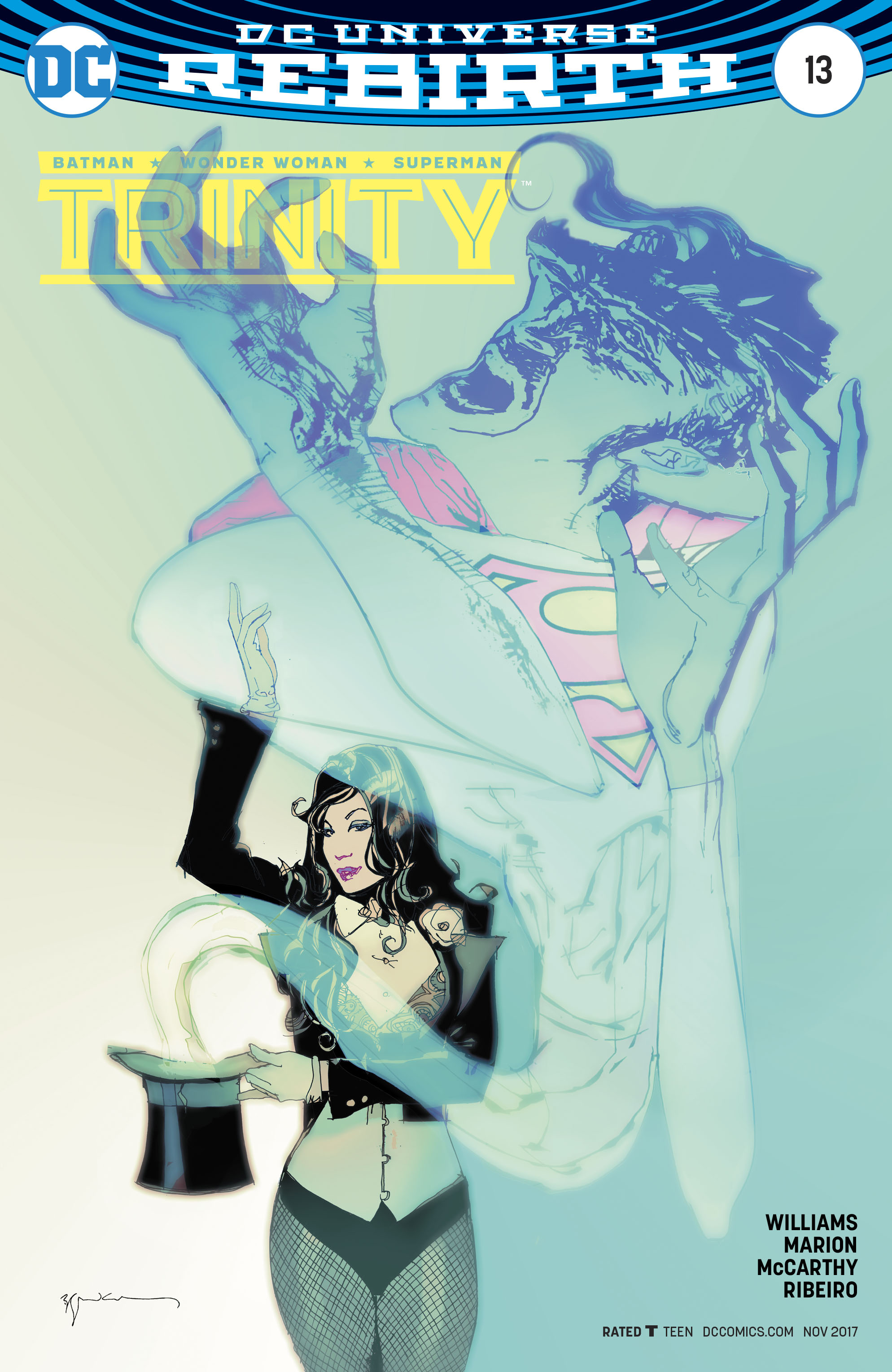 "DARK DESTINY" part two! The Pandora Pits' origins reveal themselves to Circe and Ra's al Ghul as John Constantine and the mystical trinity work with Batman, Superman and Wonder Woman to host a superpowered exorcism on Red Hood, Artemis and Bizarro.