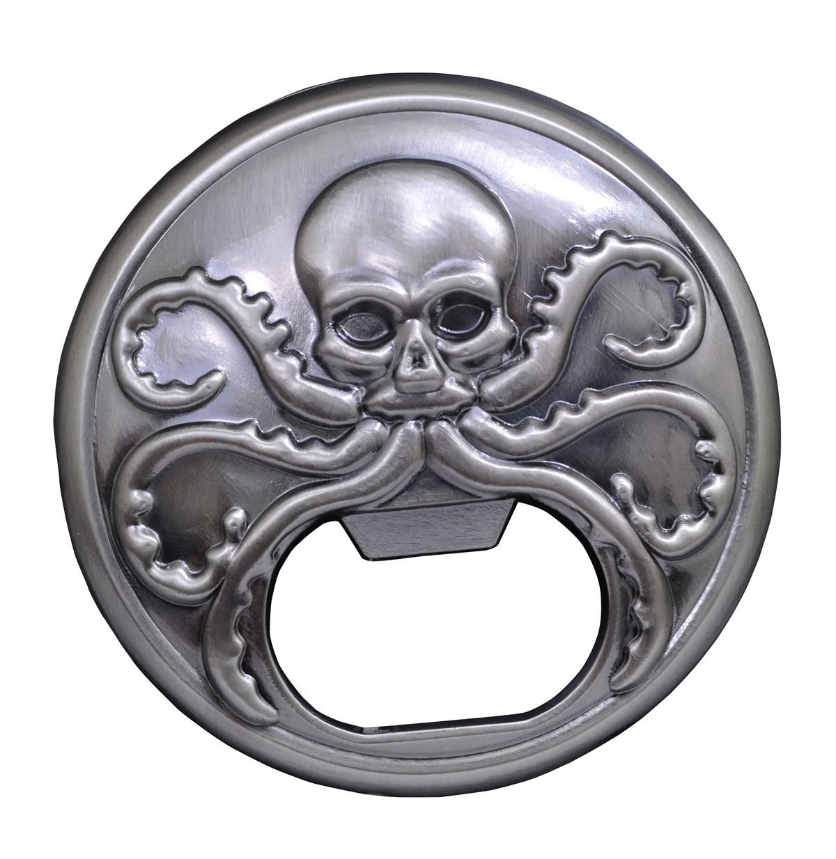 A Diamond Select Toys release! Hail Hydra! Ever feel like every time you open a bottle, two more take its place? Well you'll be able to make short of those pesky bottles with this solid metal bottle opener in the shape of a Hydra logo! With powerful magnets on the back, it will hang on your refrigerator, waiting, until it is activated to fulfill its purpose - opening bottles! Packaged in a full-color slipcase.
