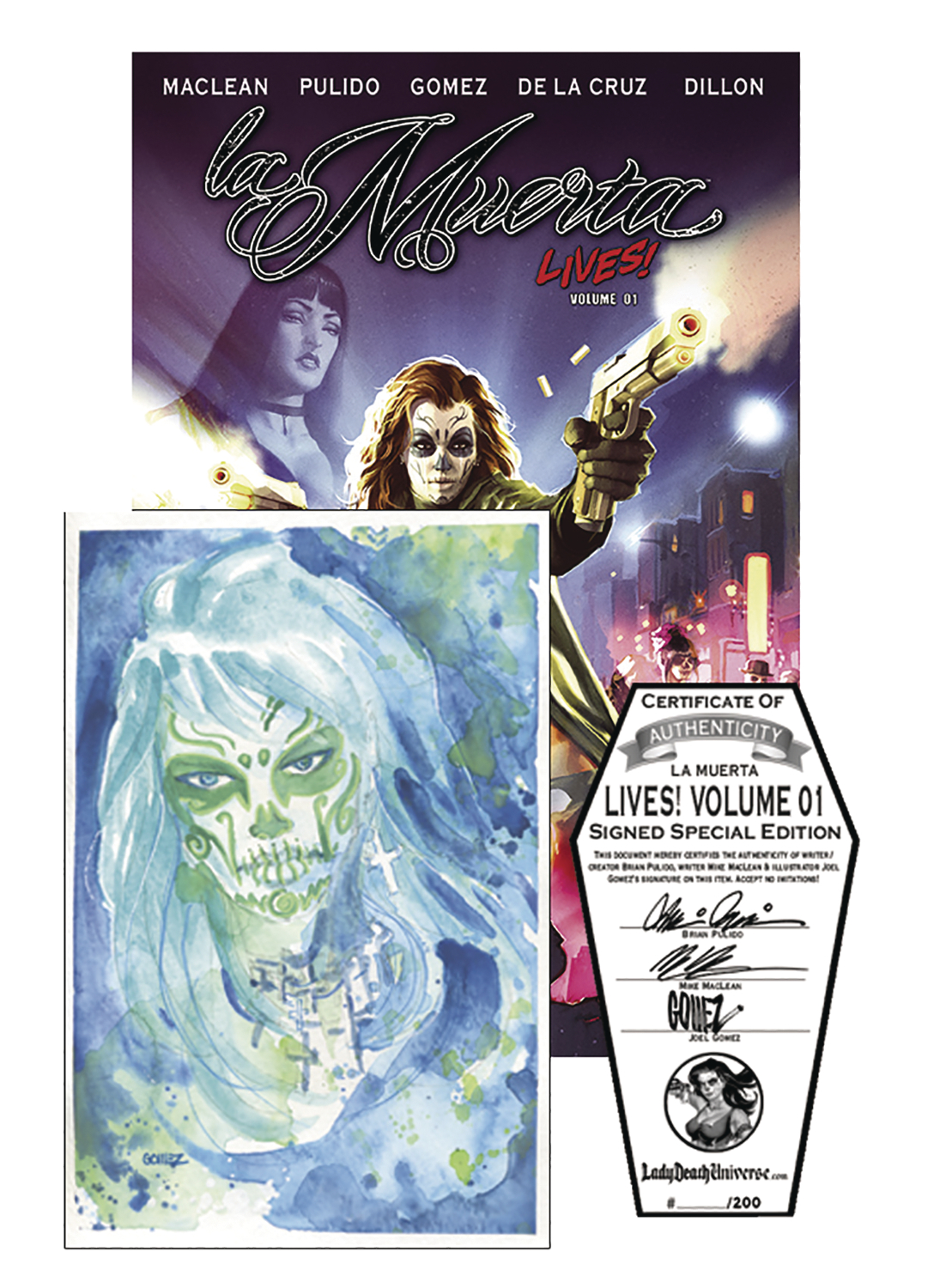 Listing Description: Comes bagged with a certified, serial numbered, coffin-shaped bookplate of authenticity signed by creator Brian Pulido, writer Mike MacLean and Illustrator Joel Gomez and an exclusive Print by illustrator Joel Gomez. Limited to 200 signed copies. Collects La Muerta #1: Descent, La Muerta #1: Last Rites & La Muerta #1: Vengeance.