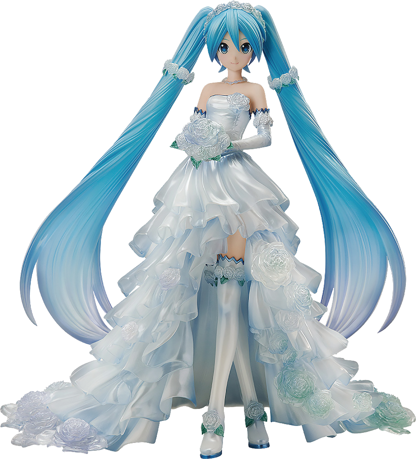 Hatsune Miku has been brought to life, this time in a pure white dress based on an illustration by KEI. Her beautiful princess line dress features roses in full bloom and a multi-layered lace design, highlighting the eternal purity of the songstress. Your blissful future together is reflected in her gentle gaze and smile. Be sure to add the beautiful bride,