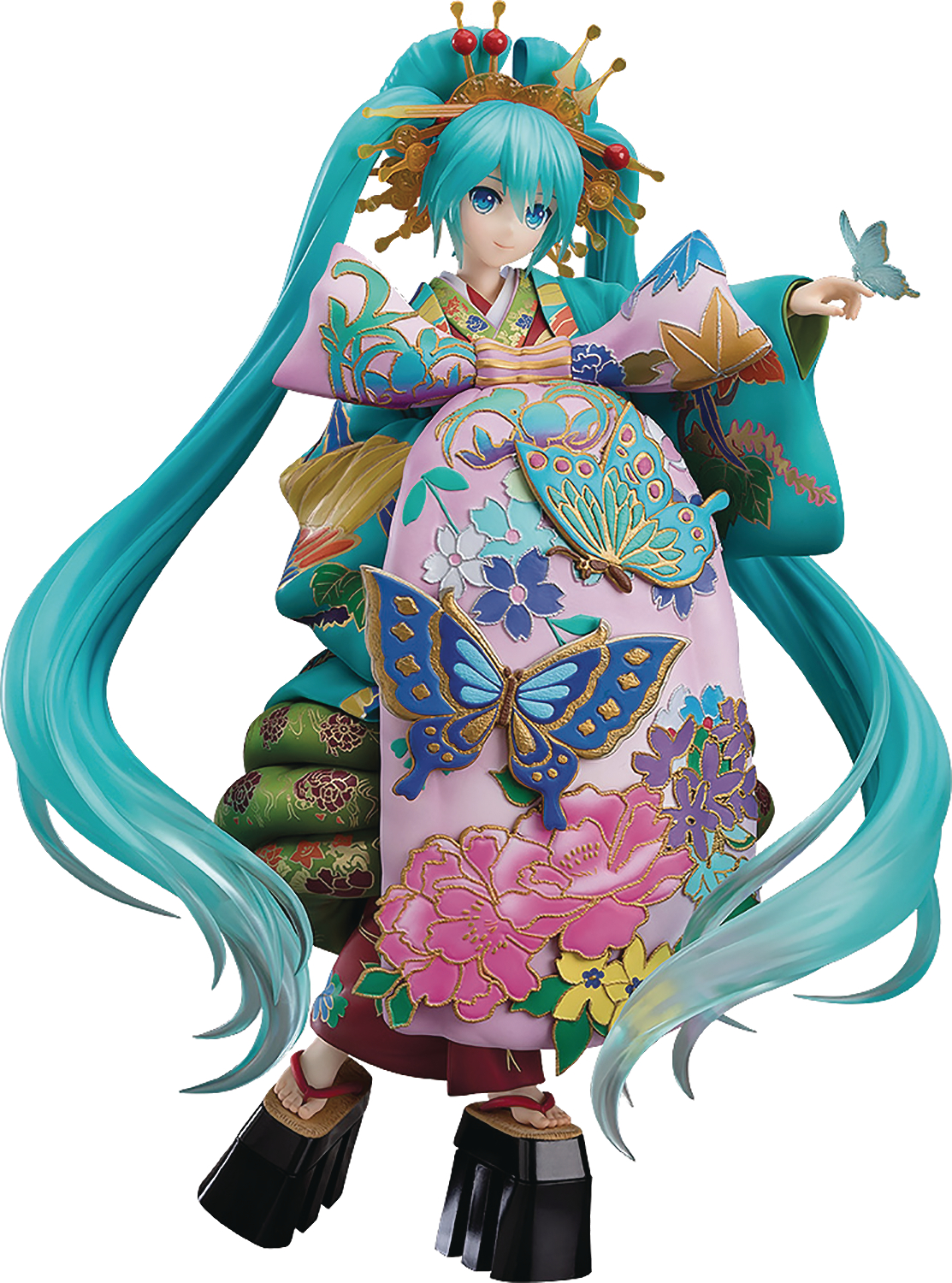 Kuruwa Kotoba Awase Kagami held at the 2017 Niconico Chokaigi. Her kimono features a detailed pattern and embroidery, all sculpted and painted with the utmost delicacy. Translucent parts are utilized for her voluminous hair, complementing her gorgeous outfit. The emerald green butterfly that makes an appearance in the play also rests gently on her fingertip.