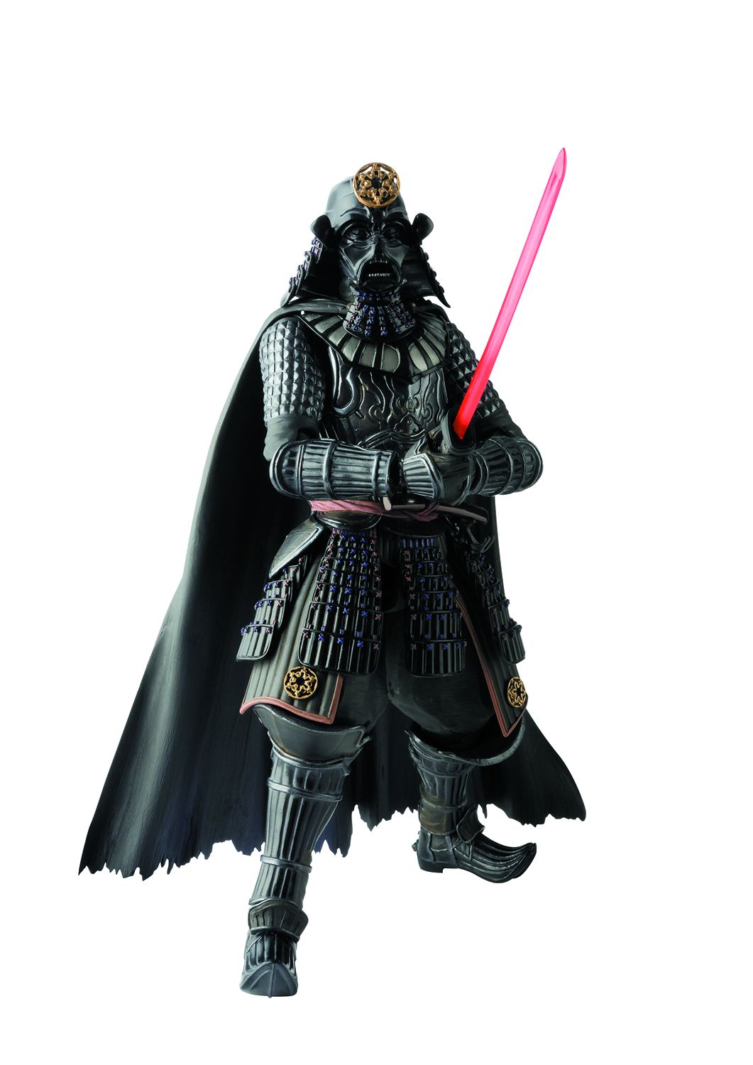 Darth Vader as a Samurai General in feudal Japan in a distinctive interpretation by acclaimed artist Takeya Takayuki, right down to the "wa"-styled Imperial insignia. The figure comes with more than 15 points of articulation, two interchangeable lightsaber parts (hilt only, and extended) and 3 sets of interchangeable hands.