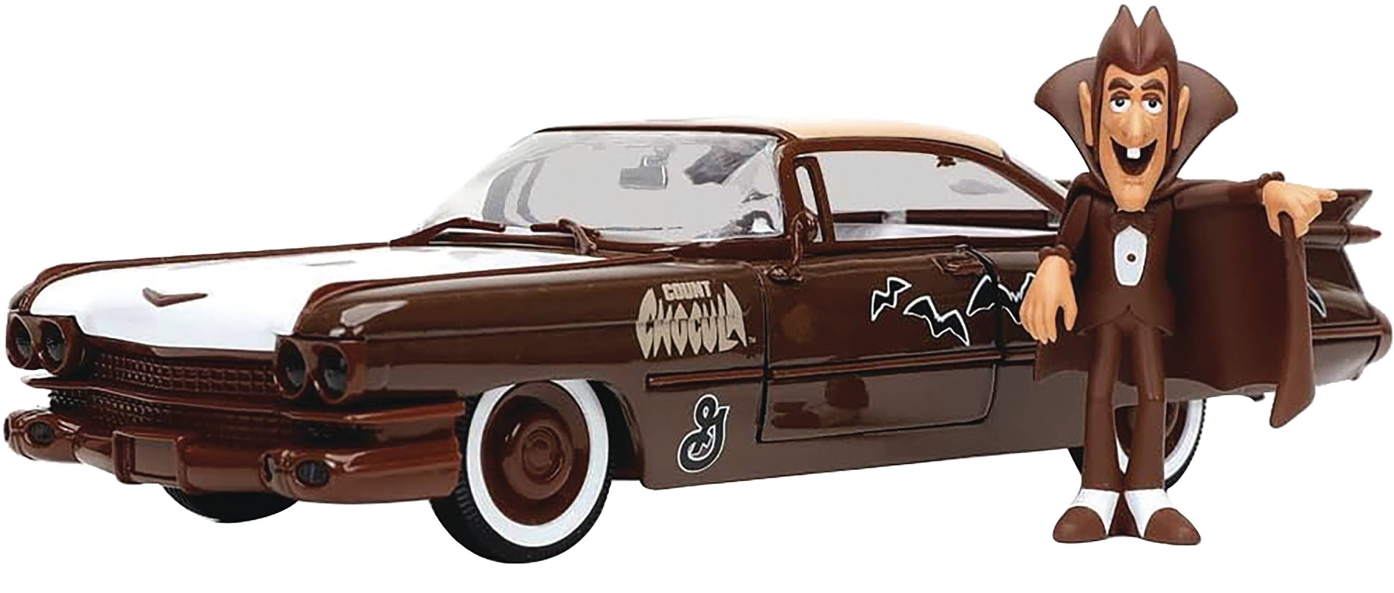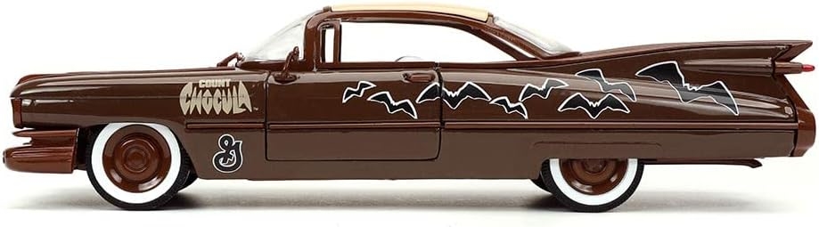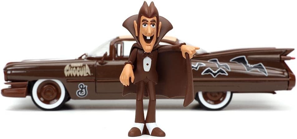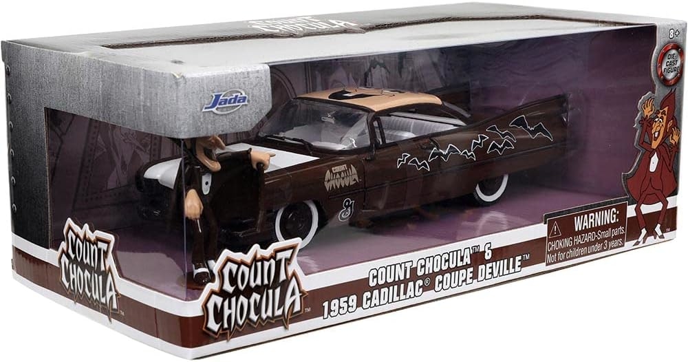 From Jada Toys. Cruise along with your favorite cheerful, chocoholic monster! This 1959 Cadillac Coupe DeVille takes styling cues directly from General Mill's Count Chocula cereal. This 1:24 scale chocolatey vehicle features a die-cast metal body and graphics on the roof! A die-cast metal Count Chocula figure is also included.