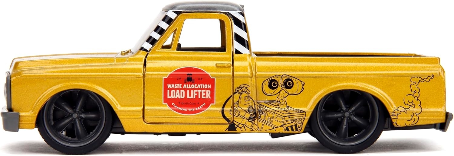 From Jada Toys. Featuring the 1972 Chevrolet Cheyenne with Wall-E-themed graphics, this 1:32 scale die-cast model is a must-have for fans of Pixar's beloved robot. Made with a 100% die-cast metal body, this collectible vehicle guarantees durability and superior craftsmanship, perfect for both play and display. Equipped with opening doors and premium rubber tires, this model offers an authentic look and feel that will excite both collectors and car enthusiasts.