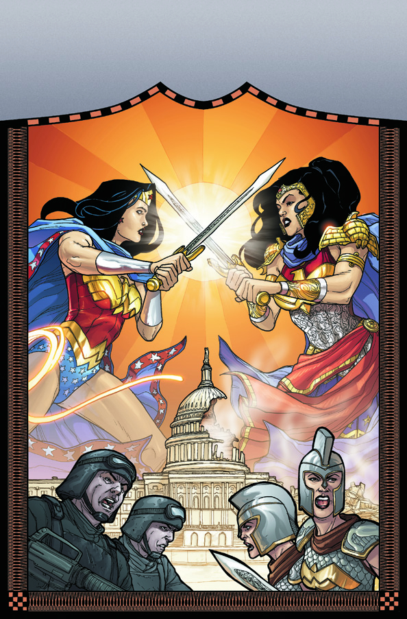And in issue #6, also shipping in August, It's all-out carnage and mayhem as all factions in the war fight the final battle! Wonder Woman takes on Hippolyta in a duel that can have only one outcome; the true reasons behind the war are discovered; and the gods make their presence known in a terrible way! Change is afoot in the DCU, and some big changes are about to happen here!