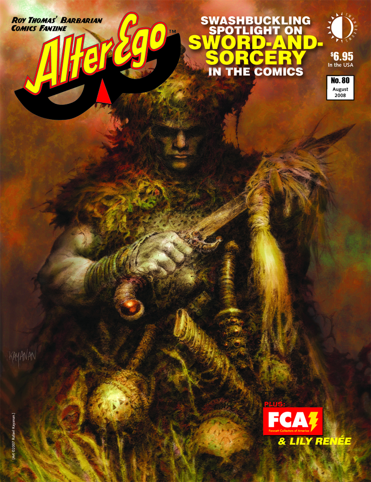 Take a look at the Sword-and-Sorcery genre in comics behind an awe-inpspirng new cover by Rafael Kayanan! Conan the Barbarian was only the tip of the iceberg! Learn about Crom the Barbarian, Viking Prince, La Reina de la Costa Negra, Nightmaster, Kull, Red Sonja, Solomon Kane, Bran Mak Morn, Fafhrd and the Gray Mouser, Beowulf, Warlord, Dagar the Invincible, Wulf the Barbarian, Ironjaw, and more - with rare art by Rafael Kayanan, Barry Windsor Smith, John Buscema, Gil Kane, Bernie Wrightson, Mike Ploog, Frank Thorne, Frank Brunner, Howard Chaykin, Frank Frazetta, Jerry Bingham, Mike Grell, Pablo Marcos, Neal Adams, Joe Kubert, Jesse Santos, Larry Hama, Mike Sekowsky, and more - plus other comics features, including P.C. Hamerlinck's FCA (Fawcett Collectors of America) section with Marc Swayze, C.C. Beck, and others, Michael T. Gilbert and Mr. Monster's Comic Crypt, and more!