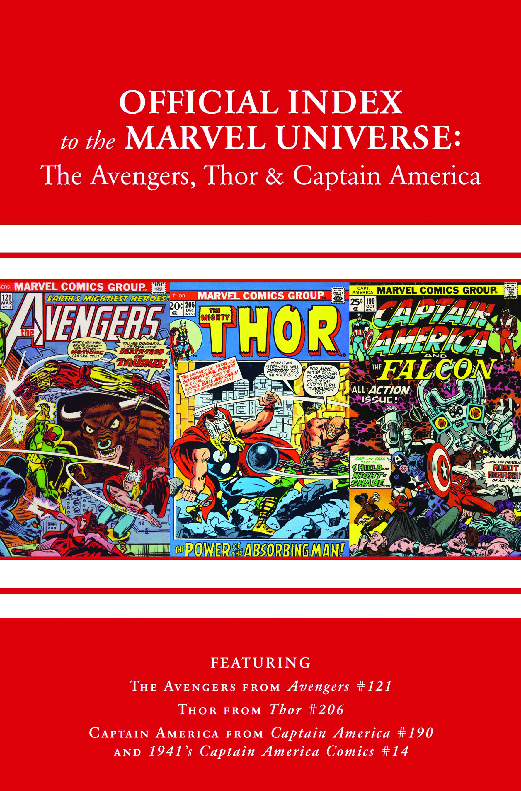The chronicle of the Marvel Universe returns as the All-New Official Index to the Marvel Universe delves into the history of three more of Marvel's most enduring titles! Return with us to the Silver and Golden Ages as we launch our coverage of the Avengers (from AVENGERS #121), Thor (from THOR #206), and Captain America (from both CAPTAIN AMERICA #190 and 1941's CAPTAIN AMERICA COMICS #14). Watch the Marvel universe's history unfold month by month as each issue provides synopses for dozens of individual comics, including back-up strips, introducing the characters, teams, places and equipment that appeared within, providing vital information about first appearances, where they last showed up and where they appeared next!