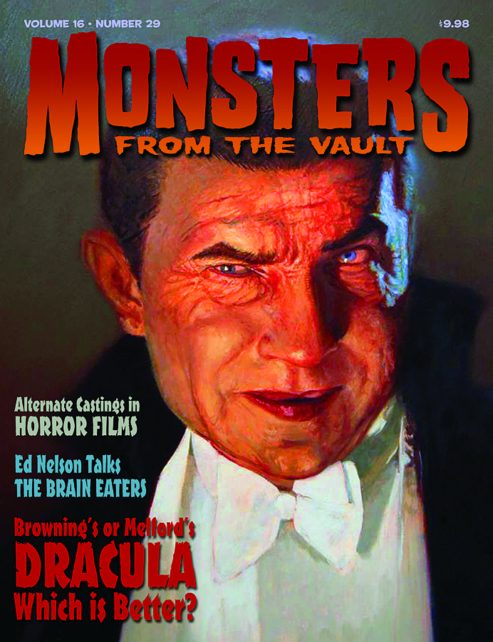 Monsters from the Vault enteres its 16th year with Daniel Horne's wonderful painting of Bela Lugosi as Count Dracula on the cover. The issue's main feature is a detailed examination of both versions of