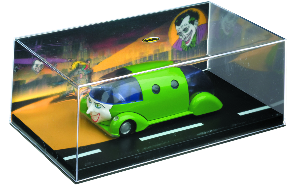 The Batman Automobilia Collection gives collectors the most definitive collection of Batman's vehicles ever assembled. These amazing die-cast vehicles reproduce the Batmobiles that have been seen in comics, on television, and in the blockbuster Batman movies. Each Batmobile comes with a unique 3-D lenticular backdrop that creates a detailed scene of the Dark Knight and his vehicle. Perfectly reproduced at 1:43-scale and made of zinc alloy, these die-case vehicles have additional metal castings for extra detail, including gadgets. Every vehicle also comes with an informative 12-page magazine that looks at the history of the vehicle and Batman himself. Continue your collection with the Batmobile from the Batman & Robin movie (#16) and the Jokermobile from Batman #37 (#15).