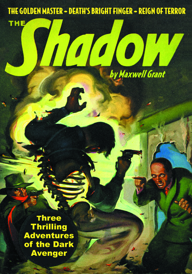 The Knight of Darkness battles diabolical supervillains in classic pulp thrillers! First, the Master of Darkness confronts his greatest superfoe, Shiwan Khan, "The Golden Master," in Walter Gibson's landmark novel that inspired the blockbuster 1994 movie. Then, The Shadow battles The Light in "Death's Bright Finger," a violent thriller by Theodore Tinsley. Finally, The Shadow and his agents are faced with a "Reign of Terror" in Bruce Elliott's final (and best) pulp novel.