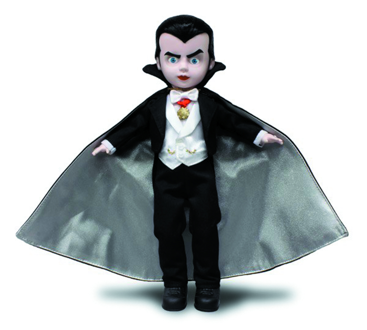 Dracula, one of the first Universal Monsters, and hands-down the most famous vampire of all time, is the latest addition to the Living Dead Dolls line. From his widow's peak to the hem of his cape, every detail of Dracula has been recreated. The Count wears one of the most regal outfits ever produced for a Living Dead Doll; he comes complete with full evening dress, his cape, his famous medallion, he red Carnellian stone ring, and even his watch chain. Special attention has been given to his hypnotic eyes; they seem to star into your very soul as one eyebrow arches upwards, beckoning you to your doom.