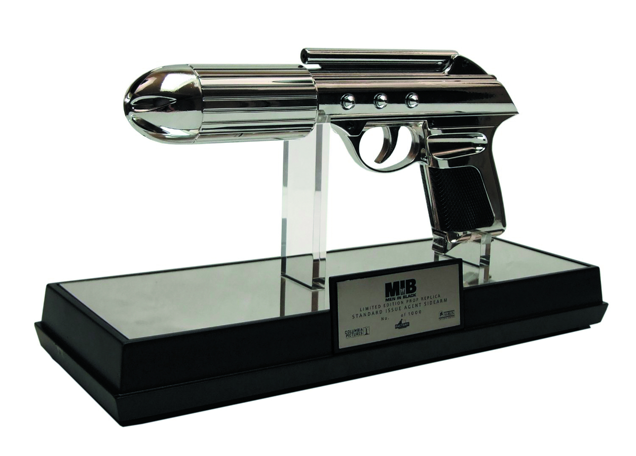 Men In Black Standard Issue Sidearm replica includes all the accurate details and features seen on the original props, as well as a number of added electronic light and sound features that were seen in the movie, but were not actually part of any physical prop. Each replica is crafted from high quality diecast and machined metal components which are then either polished or plated. The audio and sound effects were taken directly from the original studio audio tracks and digitally isolated and enhanced for clarity. Audio sound effects include power-up and weapon firing sounds. Light effects include LED barrel illumination, a firing flash and a red and green safety indicator.