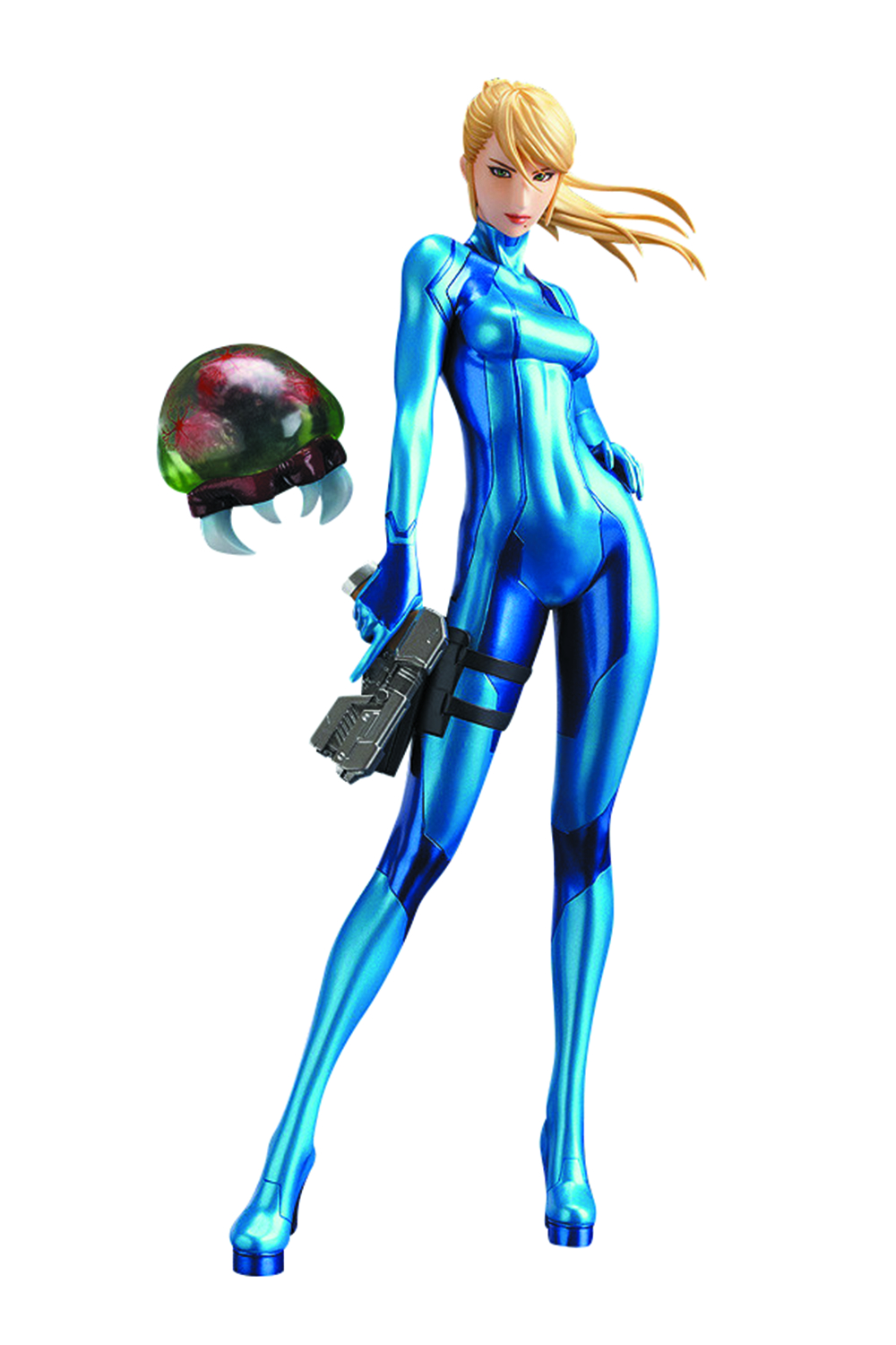 METROID: Other M, comes a 1/8-scale of the series protagonist, Samus Aran, showing off her beautiful face while wearing her Zero Suit, the outfit she wears while out on missions. She looks as cool and calm as ever as she holds her gun in her right hand, ready to take on anything that comes her way. The Baby Metroid that plays an important role in the story is also included along with Samus.