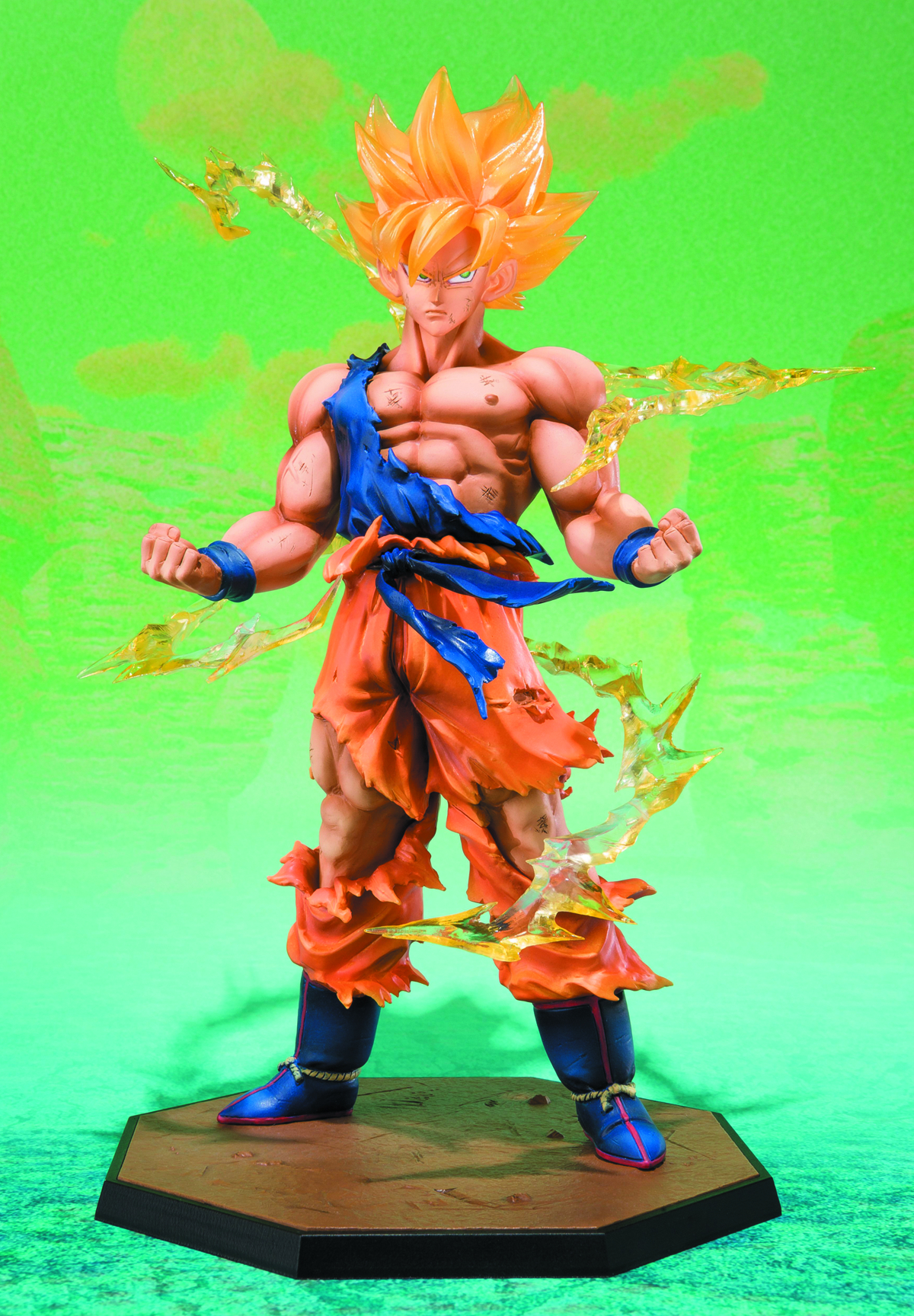 Super Saiyan Son Goku. This meticulously crafted sculpt faithfully captures details such as Goku's battle damage and depicts brilliant battle effects and Saiyan hair with translucent parts. The 6 1/4" figure also includes a special display stand. Window box packaging.