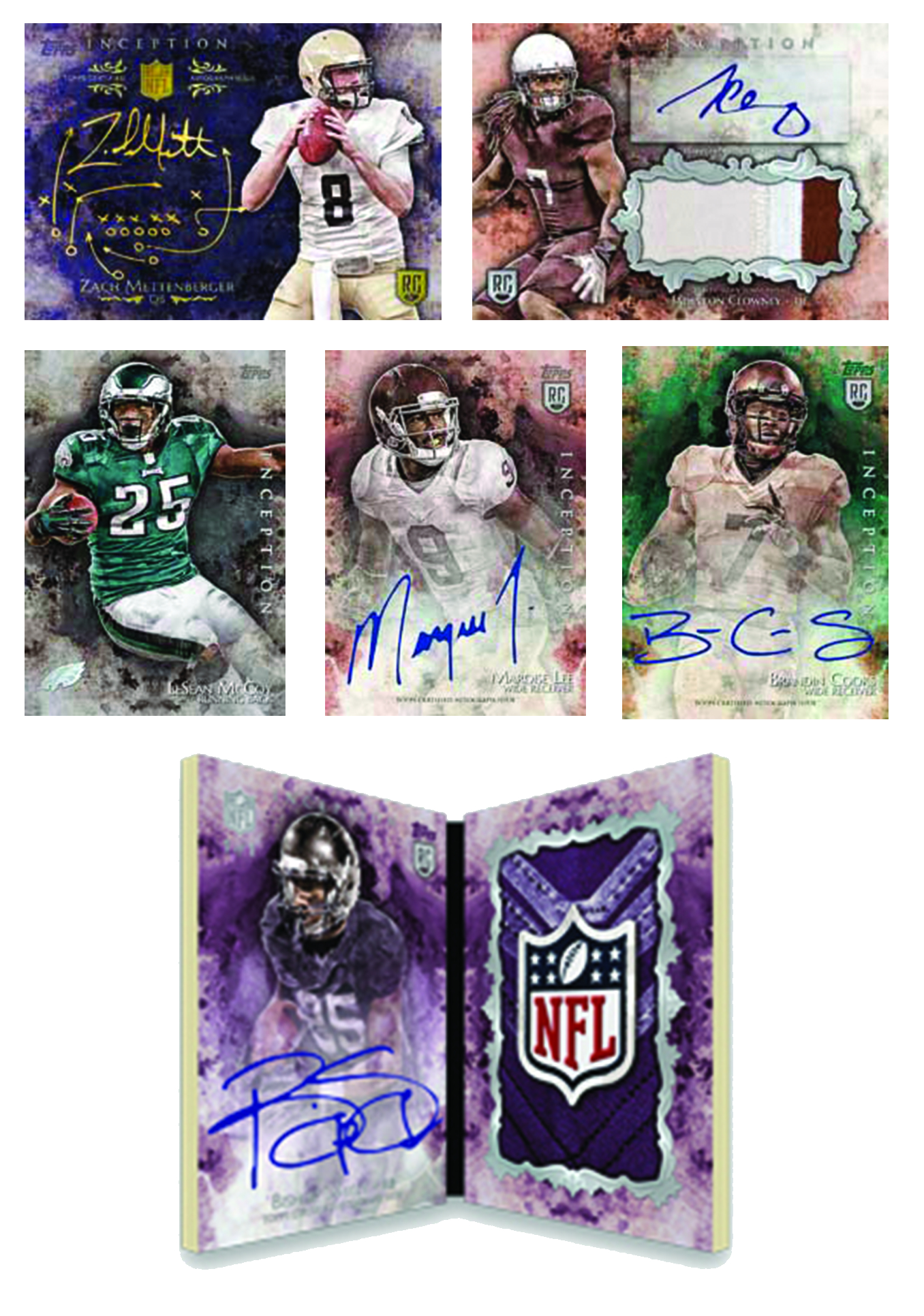 Topps 2014 Inception delivers the first high-end NFL trading cards of the season! With all-new, beautifully updated designs, Inception captures all of the excitement and anticipation surrounding the 2014 NFL Rookie class. Every box delivers 3 hits, including autographed, autographed relic, jumbo jersey, or patch relic cards. The base cards inlcude 100 top NFL veterans, and there are six levels or parallel cards. Relic cards include Rookie Patches and Rookie Jumbo Relics. Autographed Relics include Jumbo Patches, Patch book Cards, Letters Book, and Shield Logo cards. 7 cards per pack (2 base cards, 1 base Green parallel card, 1 base parallel, 2 Autograph, 1 Jumbo Relic or Patch), 1 pack per box.