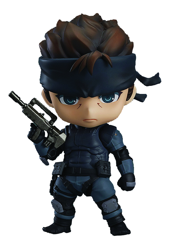 "Solid Snake"! The rough look of his character has been preserved while still giving him the cuter appearance provided by the Nendoroid design! He is the first ever Nendoroid designed to be posed in a prone position, allowing you to display him sneaking around just like in the game! Optional parts include his handgun, an assault rifle, and a cardboard box to keep him hidden! An optional low-polygon face part is also included, allowing fans of the original game to enjoy the classic Snake once again!