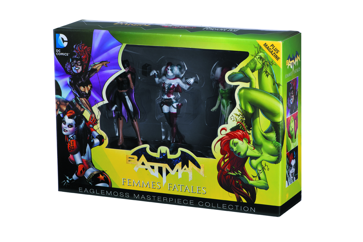 Batman: Femmes Fatales is the second offering from the Eaglemoss Masterpiece Collection. Featuring three of Gotham City's feistiest females - one bold ally of the Dark Knight, and two of his most capricious enemies - this box set contains three 1:16 scale figurines crafted in metallic resin and hand-painted. The boxset comes complete with a 48-page magazine, certificate of authenticity and is sealed with a numerical sticker.
