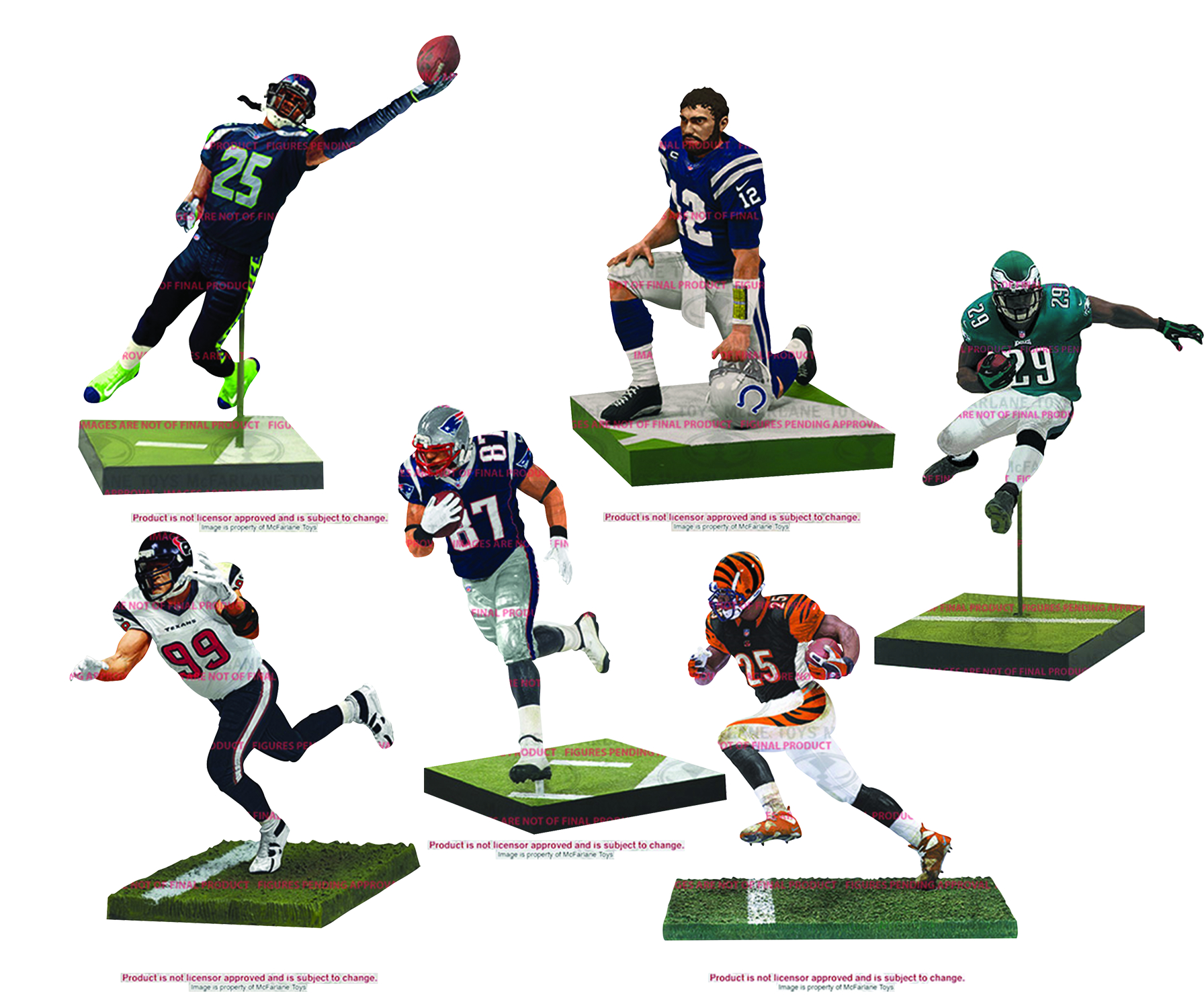 Richard Sherman of the Seattle Seahawks. All players in NFL 36 will include a collector level version. Murray (Home Uniform) and Sherman (All Grey) will have a Bronze figure, while Luck (White Jersey) and Watt (All White) will be Silver level. Gronkowski will be seen in his classic uniform as a Gold level figure, and Bernard will be the sole All Star level figure, wearing his All Black uniform.