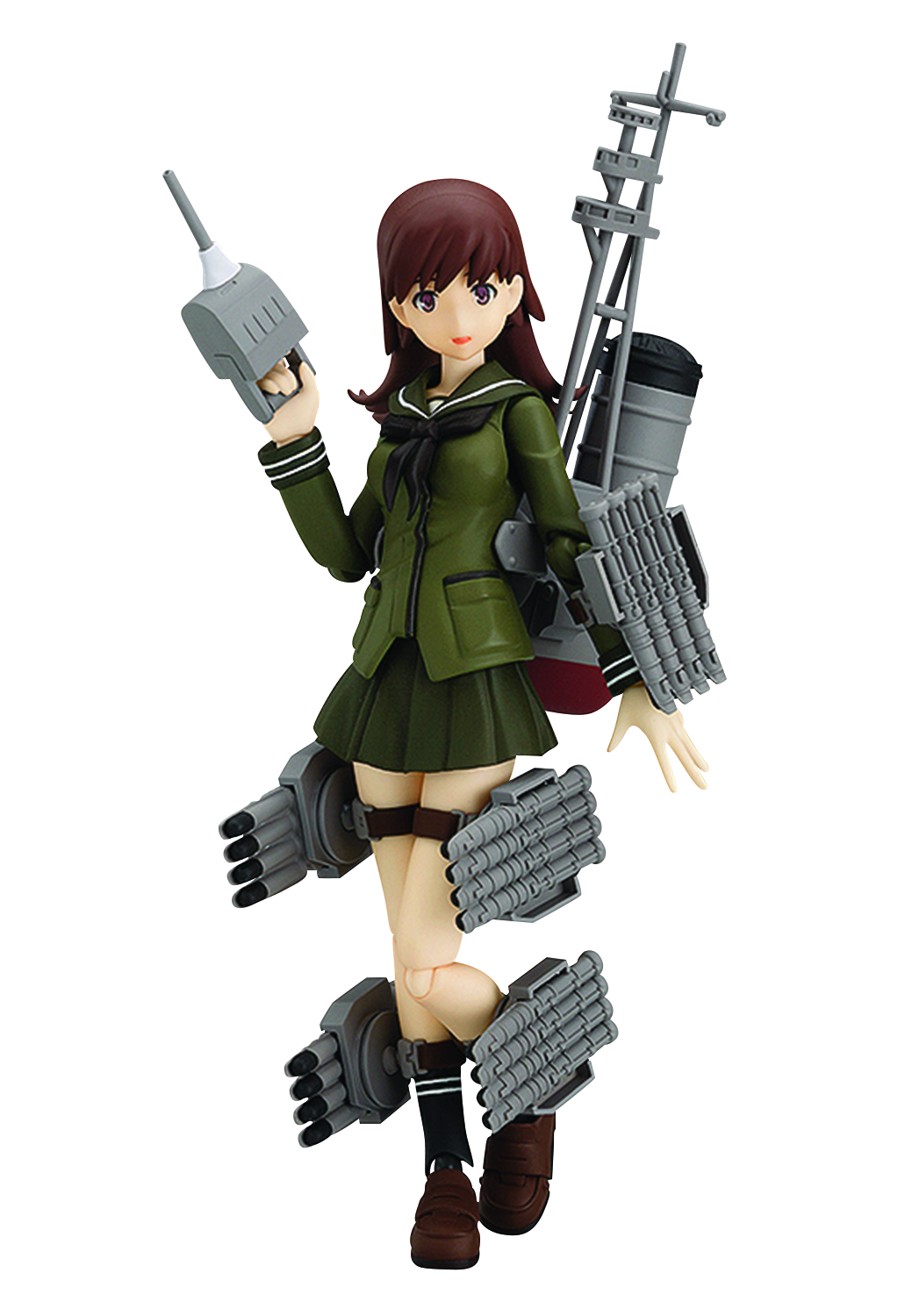 Ooi! Using the smooth yet posable joints of figma, you can act out a variety of different scenes. She comes with three expression parts including a gentle standard expression, a worried expression and a cheerful smile. Optional parts include her single-barreled turret, five four-tube torpedo launchers and a two-tube torpedo launcher from before her remodeling. Alternate leg and skirt parts can display her in various different poses. An articulated figma stand is included.