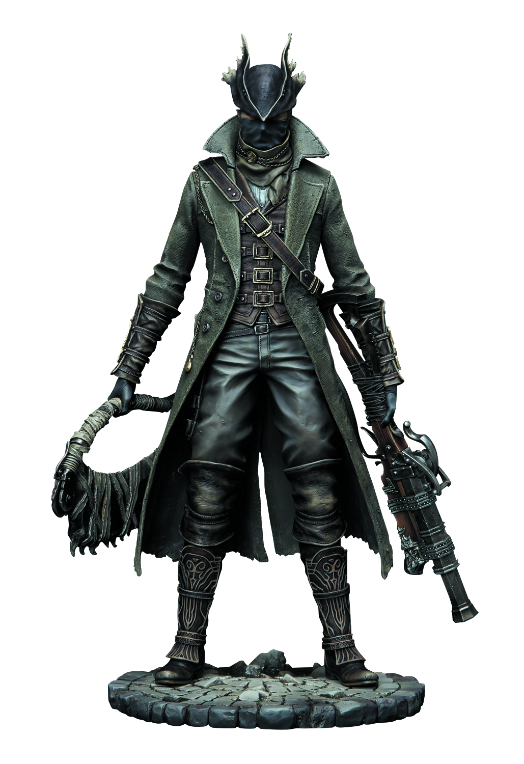 Bloodborne - dressed in his "Hunter Set" - are faithfully sculpted. The main visuals of the video game's jacket is recreated as a fine art statue, capturing both the front and picturesque back side. His "Saw Cleaver" is armed in his right hand, and "Hunter Blunderbuss" is in his left hand. The saw can transform into a cleaver, just like in the video game. Cobblestones and puddles are recreated on the round base, capturing the video game's world and unique gothic atmosphere. The sculpture also captures the character's heroic yet subtle posture, standing amidst the deadly "plagued" air of the environment.