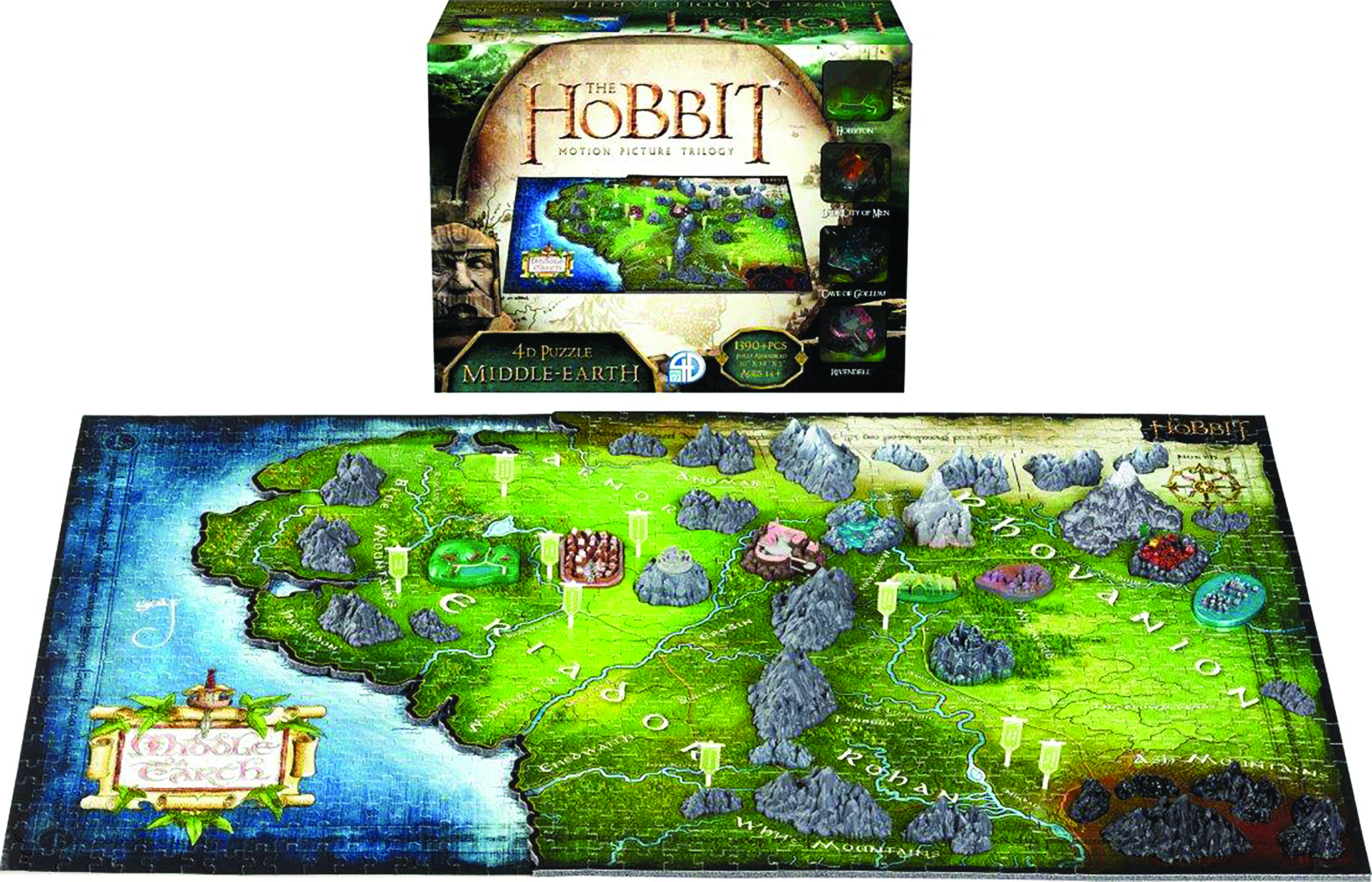 The Hobbit as adapted by Peter Jackson and his artists for the acclaimed film trilogy, this 3-dimensional map will take you from the Shire in the west, over the mountains to Rivendell, east through Mirkwood, and finally to the Lonely Mountain in the east. The first two layers of the puzzle to form a map of Middle-earth's rivers, islands, cities, and geography.