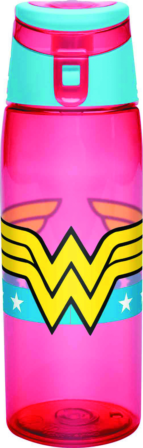 From Zak Designs. Thanks to DC Comics' heroic Amazon, no more disposable bottles - the local landfill will thank you! This 100% reusable Tritan bottle is shatterproof, break-resistant, durable with a leakproof lid and built-in carrying loop. The easy-open, flip top cap locks into place when open, and the wide mouth opening fits ice cubes.